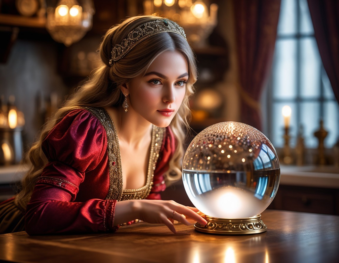 A woman in a regal red gown gazes intently at a shimmering crystal ball. Her long, flowing hair is adorned with a jeweled headpiece, and soft candlelight fills the elegant, mysterious room.
