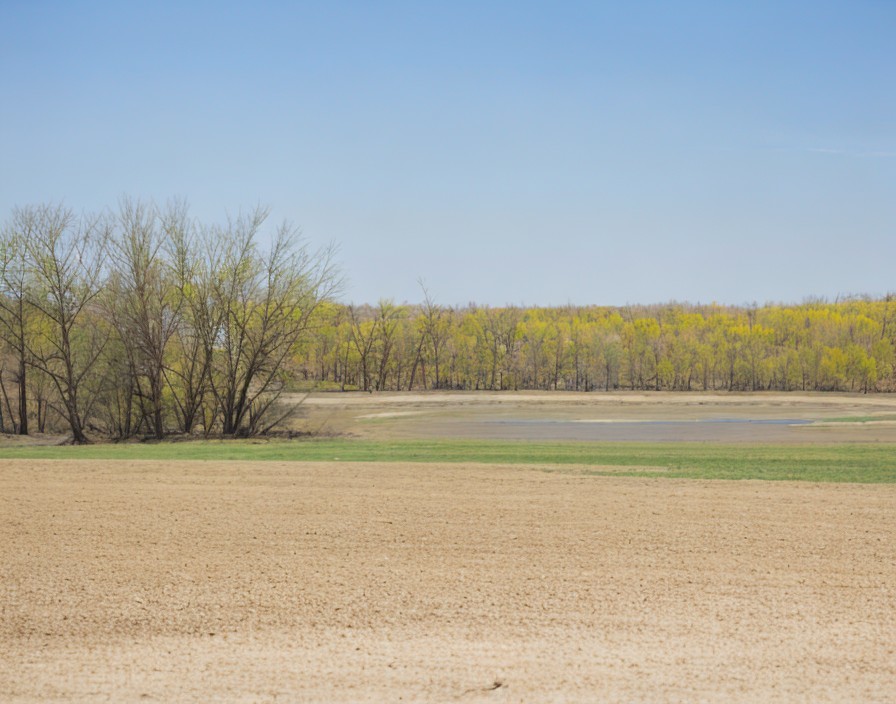 A tranquil scene with a calm lake bordered by leafy trees and a clear, expansive sky above.