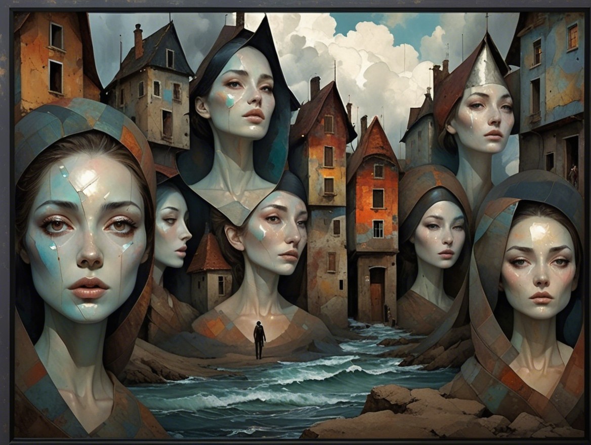 A surreal scene features a floating, colorful house complex above a misty beach. A lone figure gazes at this whimsical structure, while balloons drift among fluffy clouds.