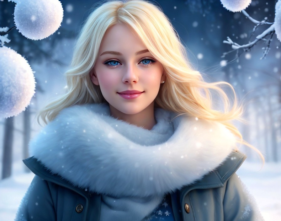 Blonde Woman in Winter Attire with Snowflakes on Snowy Background