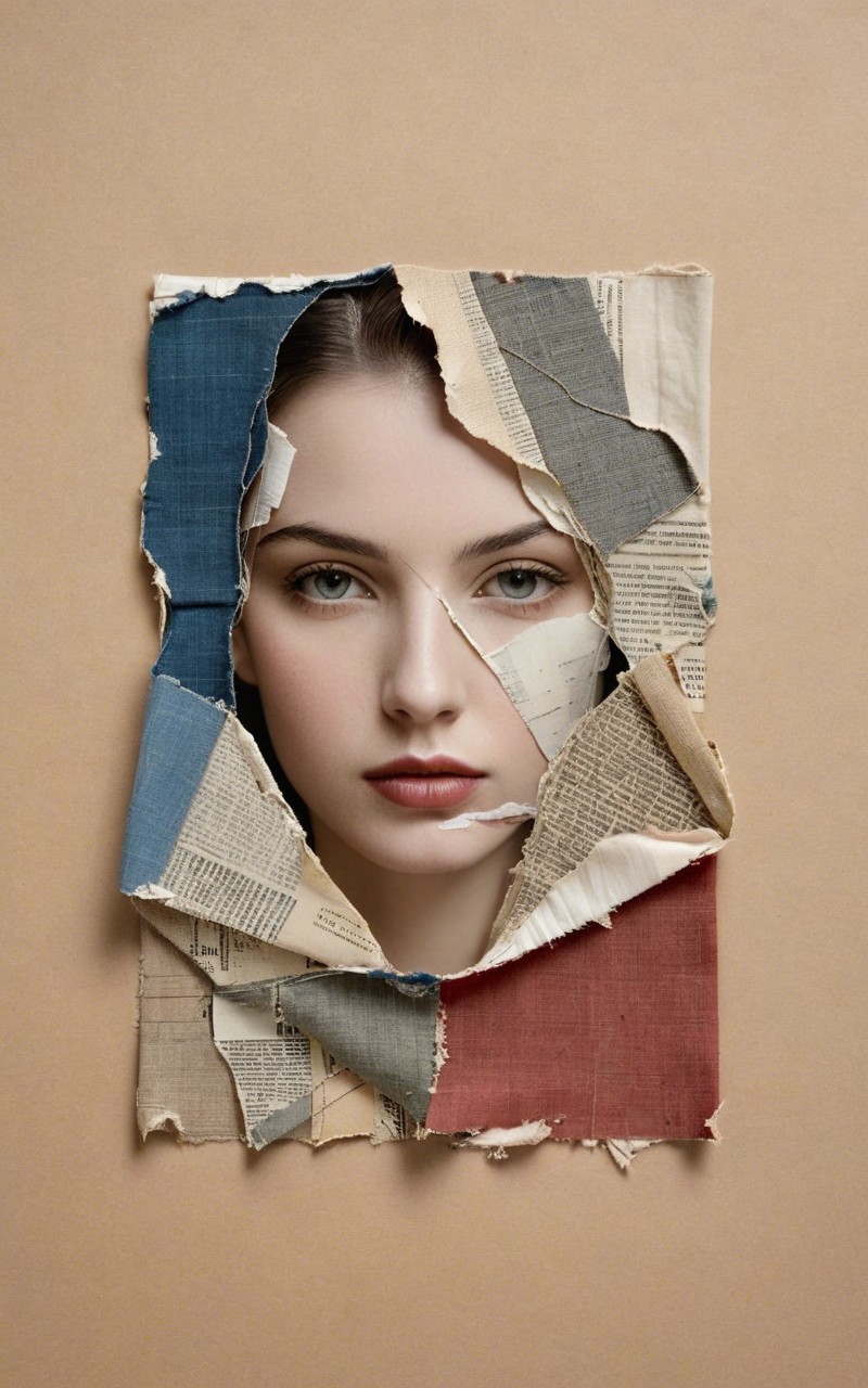 A striking portrait of a woman emerges from a torn patchwork of textured fabrics and old newspaper, creating a captivating blend of art and identity against a beige background.
