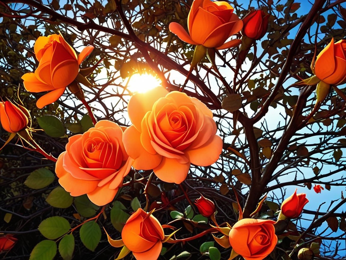 A beautiful orange rose blooms majestically, illuminated by sunlight. Dewdrops cling to its petals, enhancing its vibrant colors against a clear blue sky and lush green leaves.
