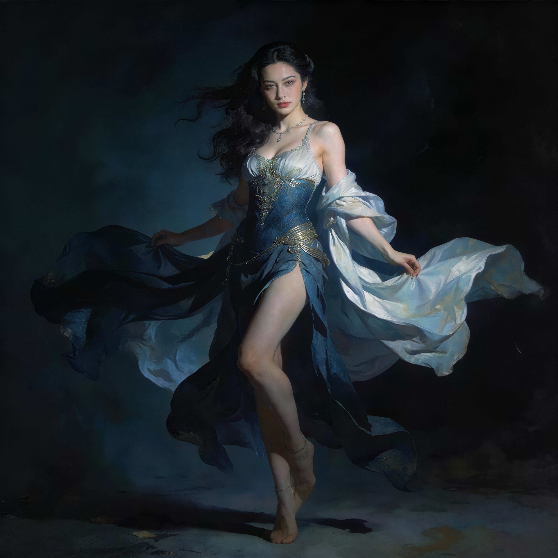 A full-shot image of a beautiful Asian woman in a long flowing historical dress moving elegantly by herself. She has long flowing black hair, a slender physique, and fair skin, which is in contrast to the dress that is predominately blue. The dark atmosphere behind the dress illuminates the white color of