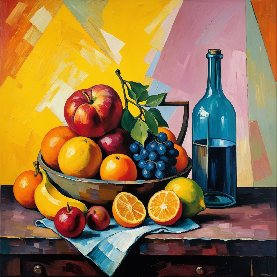 A vibrant still life showcasing a bowl overflowing with colorful fruits like apples, oranges, and bananas, accompanied by a green jug and a bottle against a bright, abstract background.
