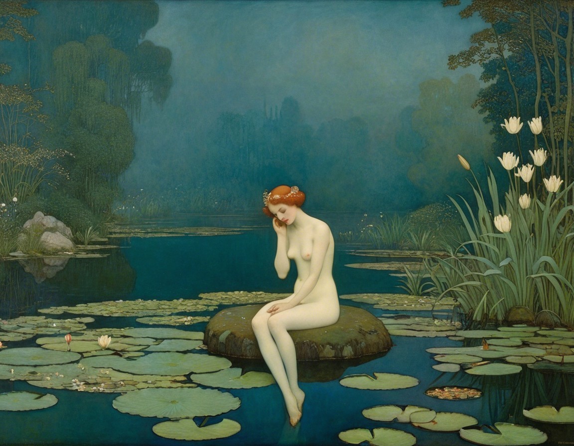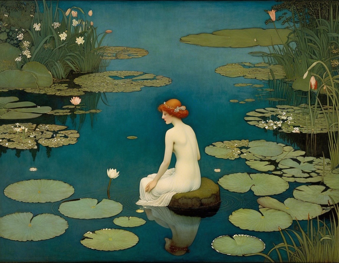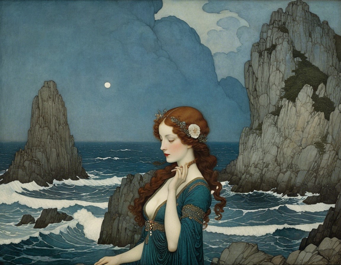 A serene woman sits on a rock by a tranquil sea, surrounded by rugged cliffs and calm waters. She gazes thoughtfully, embodying peace in a picturesque coastal landscape.