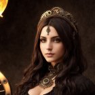 A young woman with long, dark hair and a crown gazes at the viewer. She wears an elegant black dress and a striking necklace, framed by a glowing circular light in the background.