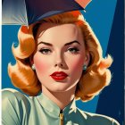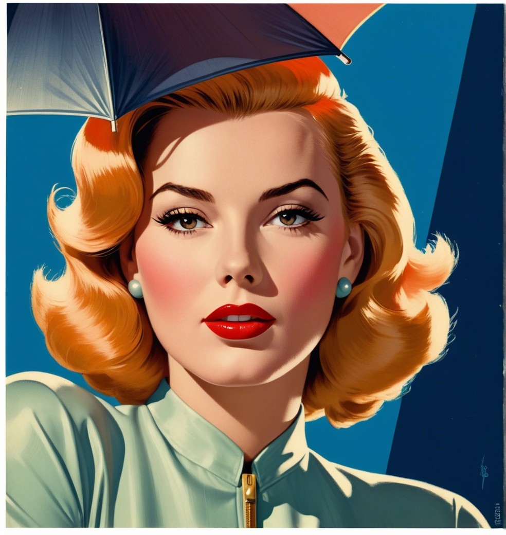 A glamorous woman with blonde, wavy hair holds an umbrella, her striking red lips and vintage style exuding classic elegance against a vibrant blue background.