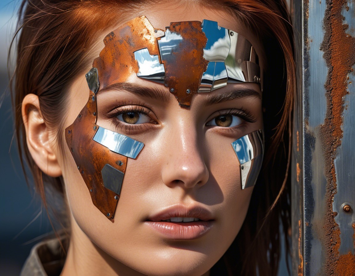 Prompt: "''Hyper-realistic glitchcore surrealism: a single, ultra-high-definition 128K image of a woman’s face, meticulously integrating both rusted iron and mirrored stainless steel elements. The left side of her face embodies rusted iron, with hair appearing as if formed from textured, corroded metal. Her skin has a rugged, aged appearance with detailed rust patterns, and her eyes reflect a weathered, metallic sheen. Her lips are darkened with rusty hues, seamlessly blending with the iron element. The right side of the face represents mirrored stainless steel, featuring hair that appears sleek and polished with a high-shine finish. Her skin has a smooth, reflective quality, capturing light with a mirrored effect. Her eyes are sharp and clear, reflecting the surrounding environment, and her lips have a bright, metallic sheen, perfectly integrating with the stainless steel. The image is captured with unparalleled detail, highlighting every nuance of texture and reflection. The sophisticated chiaroscuro lighting and ultra-high-resolution grain texture enhance the vivid realism of the face as it seamlessly incorporates both rusted iron and mirrored stainless steel elements.''"
