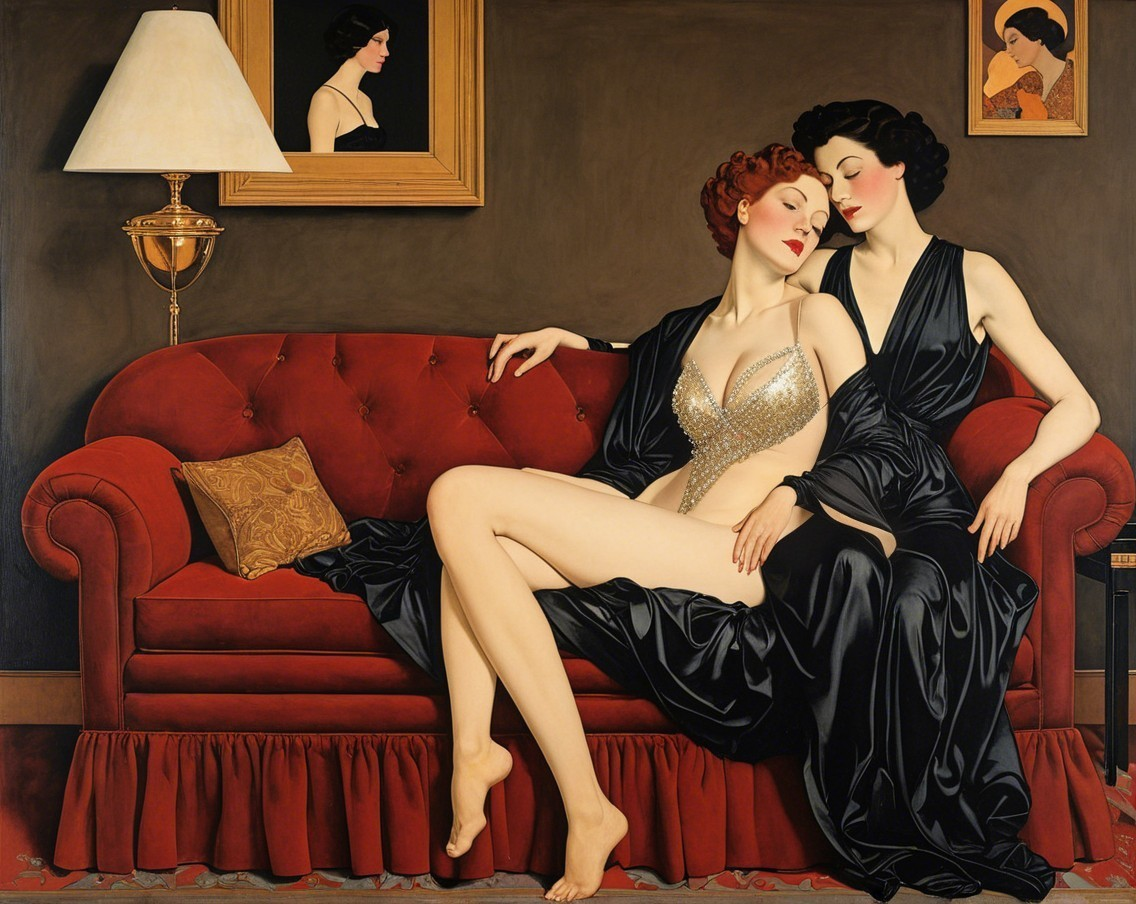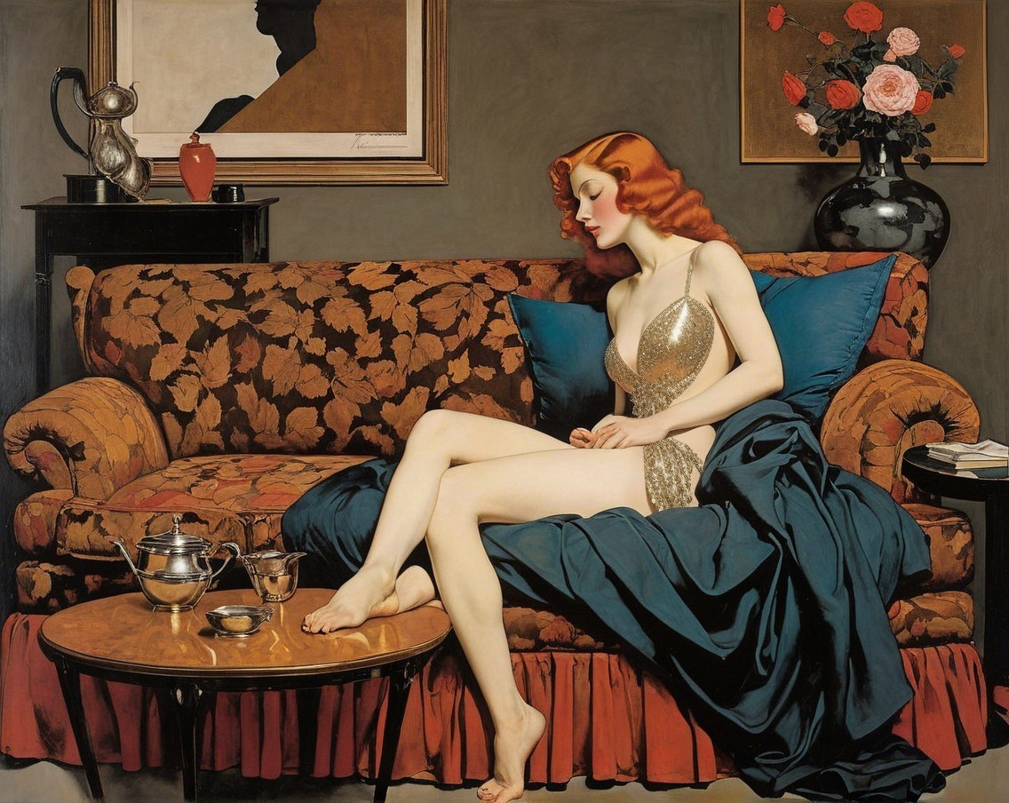 The artwork of Walter Martin Baumhofer and rené gruau is characterized by its whimsical, beautiful, poignant, and touching nature. The color palette often includes shades of rose, gold, rust, burgundy, and black. Artists like Annigoni, Egon Schiele, Milo Manara, Botticelli, Catrin Welz-Stein, Jean Metzinger, and Klimt create soft watercolor pieces with extra water, showcasing an Art Deco style. The attention to detail is evident in the perfect eyes, perfect hands, and highly detailed faces. Complementary colors are used to enhance the overall effect. Watercolor and ink splatters add a dynamic element to the artwork, often set against a dark blue background. Artists like greg rutkowski, loish, rhads, beeple, makoto shinkai, lois van baarle, ilya kuvshinov, rossdraws, tom bagshaw, and alphonse mucha employ techniques like global illumination to create detailed and intricate environments. Other notable artists in this style include Arthur Rackham, Grant Wood, Paul Klee, Lisa Frank, Van Gogh Illustration By Marguerite Delorme, Chokha, Marguerite Zorach, Edward Gorey, and junji ito. The use of gold and silver leaf colors adds a luxurious touch to the artwork
