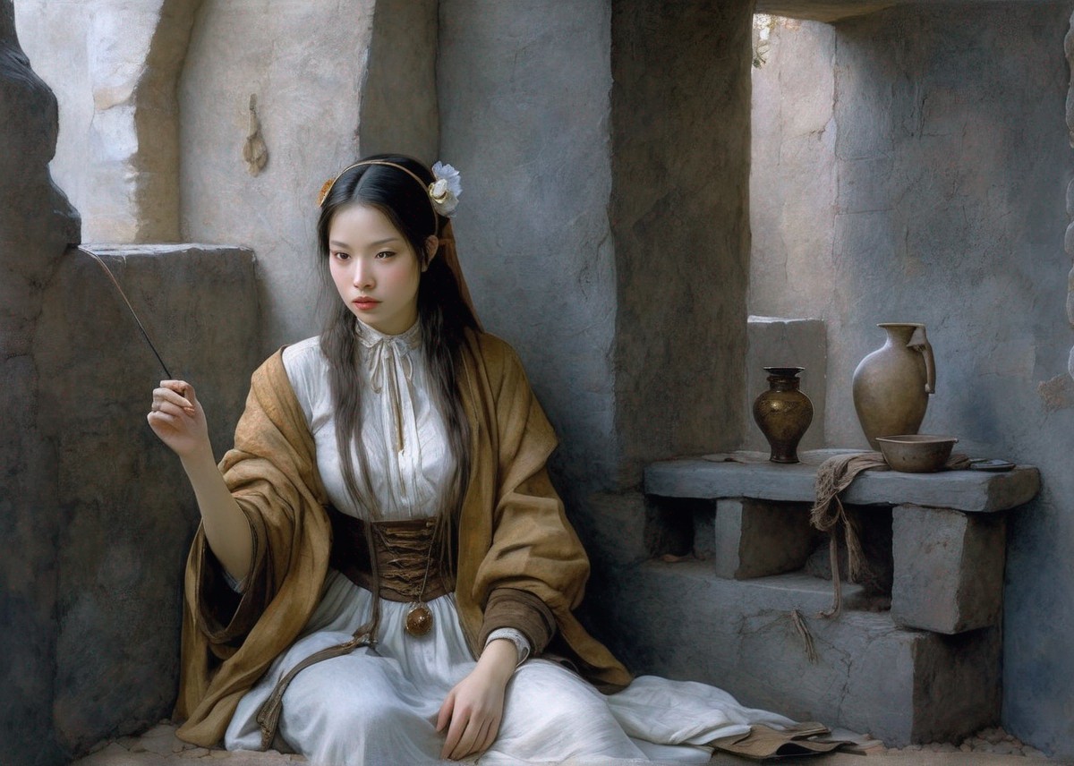 A woman in medieval attire sits in a stone courtyard with towers and a robed figure in the background.