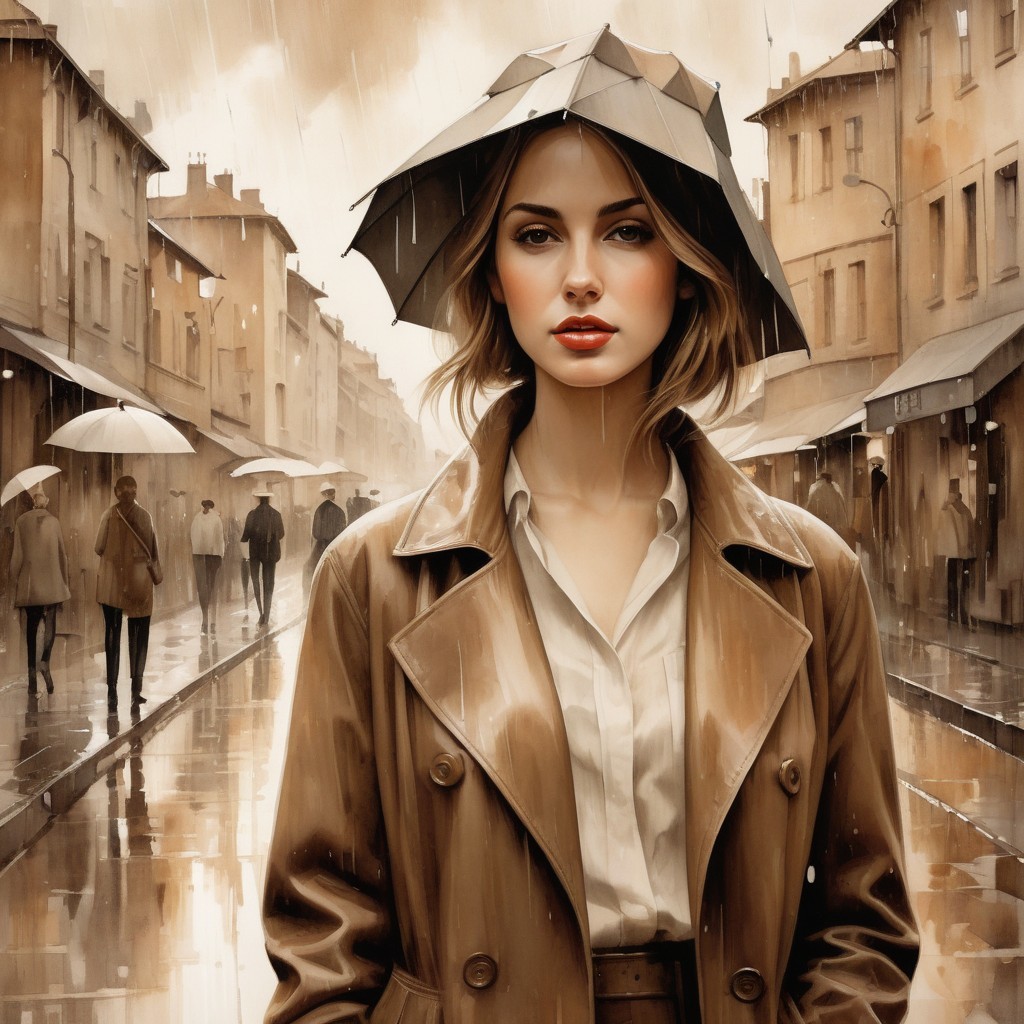 A stylish woman in a fedora and trench coat stands in a rainy, vintage city scene with umbrellas and classic cars.