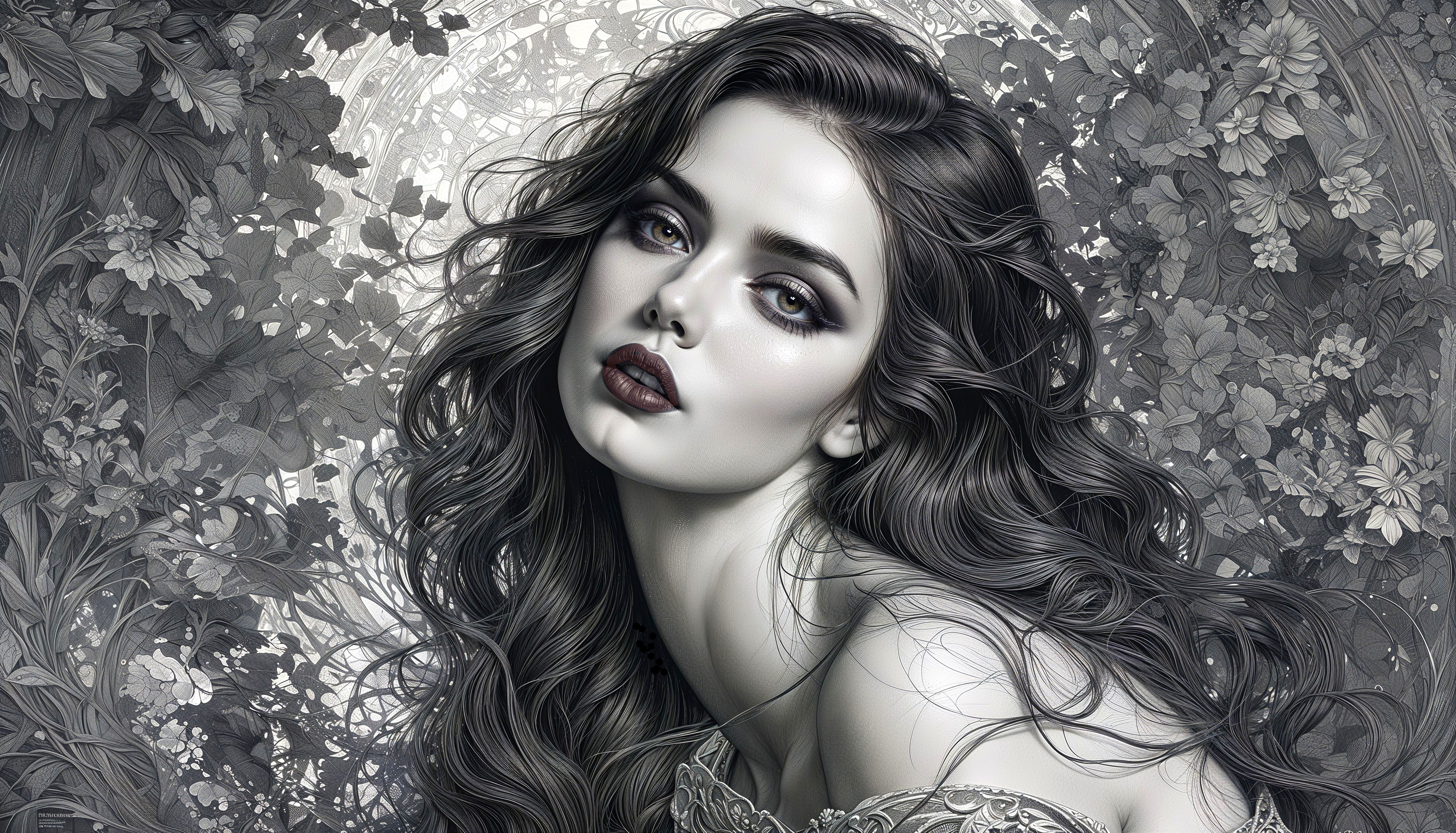 A striking portrait of a woman with flowing dark hair and captivating eyes, set against a backdrop of intricate floral designs, evoking a sense of mystery and elegance.