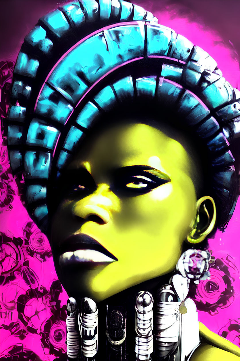 Prompt: "Afrofuturistic futuristic African warrior, Imposing, Sci-Fi Steampunk Art Deco Beautiful portrait and roses Enki Bilal Dramatic, graffiti art is elaborate monochromatic acrylic spray paint in the style of yoji shinkawa, bold epic brushstrokes , silver, magenta, teal, neon yellow, Full Body, Intricate detail, Amber skin cobalt and neon highlights, Graphic Design, background in the style of Jeremy Man cityscapes"