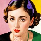 A young woman with curly brown hair and a lavender headband rests her chin on her hand. She wears a green shirt, gazing intently at the viewer against a vibrant yellow and pink background.