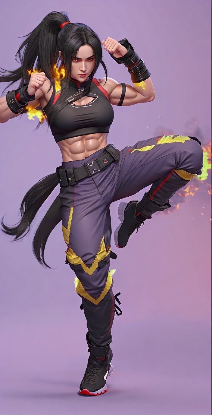 + Prompt:A female martial artist with long black hair and fiery eyes wearing a red-black crop top, and red black combat pants which shows off her incredibly cut abs and muscular arms.