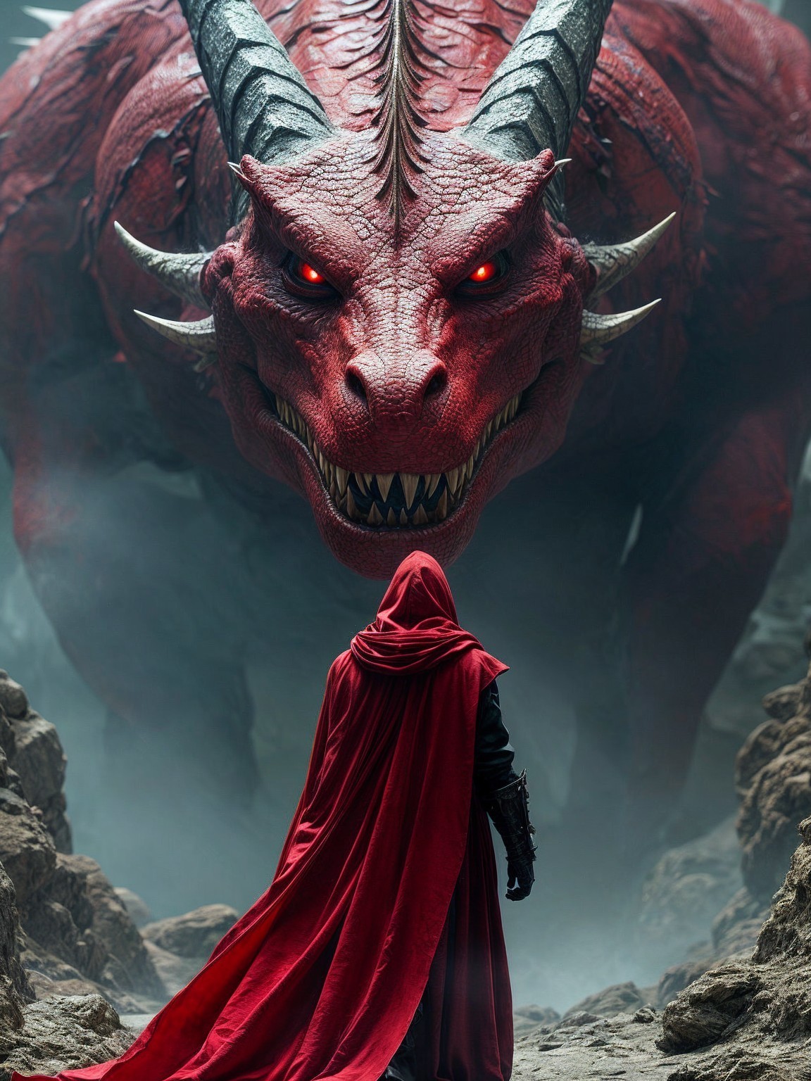 A cloaked figure stands boldly before a massive red dragon, its glowing eyes piercing through the mist. The scene evokes a sense of confrontation between dark magic and fierce power.