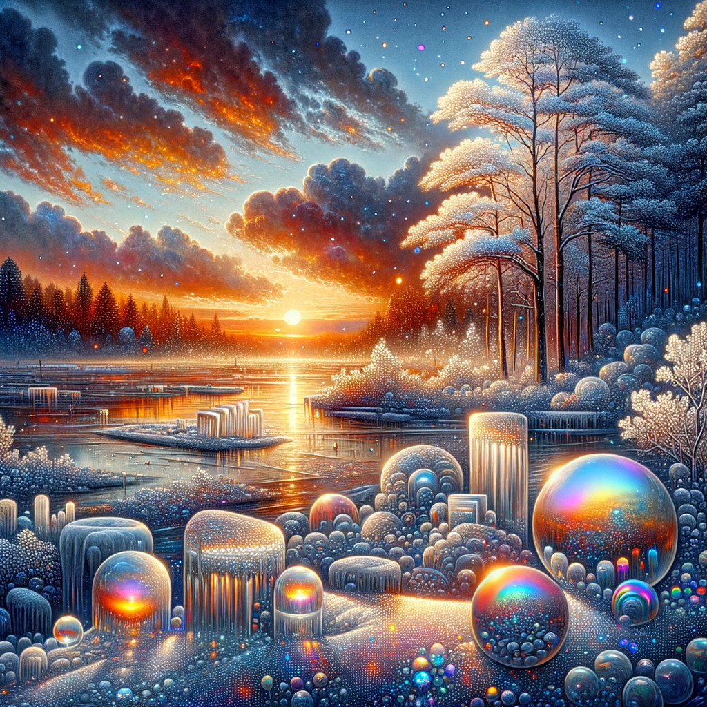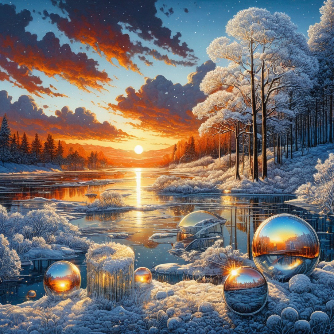 Snowy twilight landscape with radiant sun setting over tranquil river