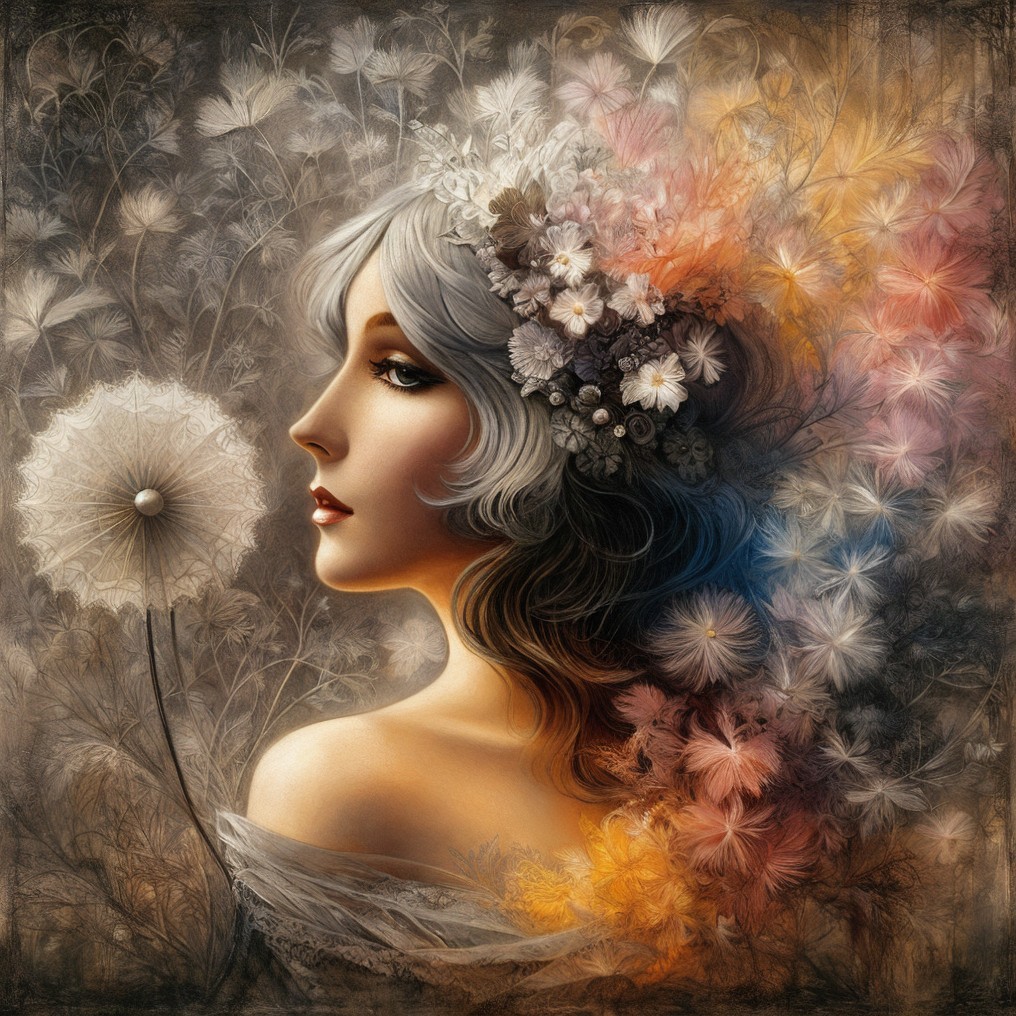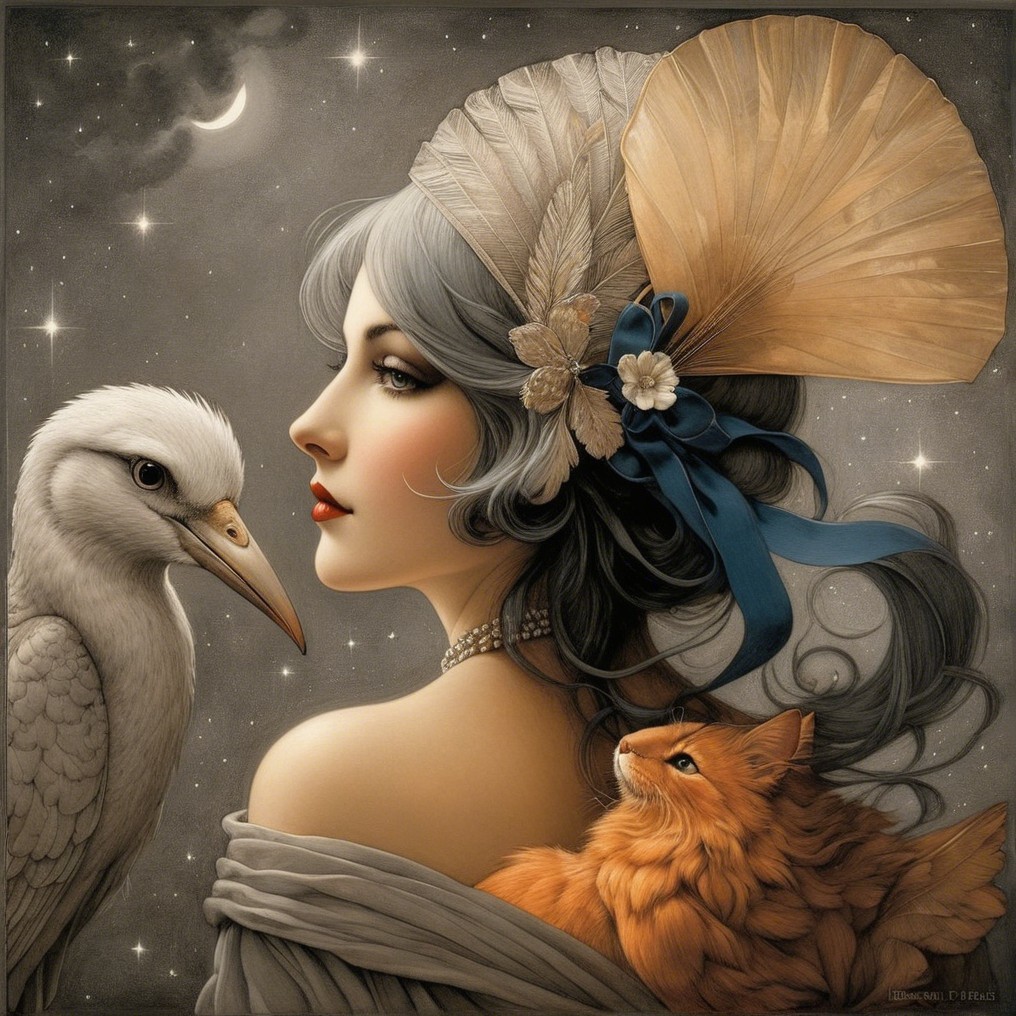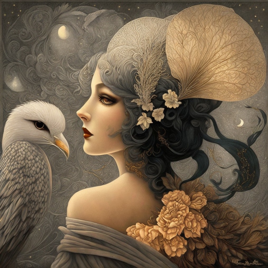 A woman with elegant, dark hair adorned in a lavish feathered headdress gazes sideways. Beside her, a white bird watches intently, creating a striking contrast in this artistic portrait.