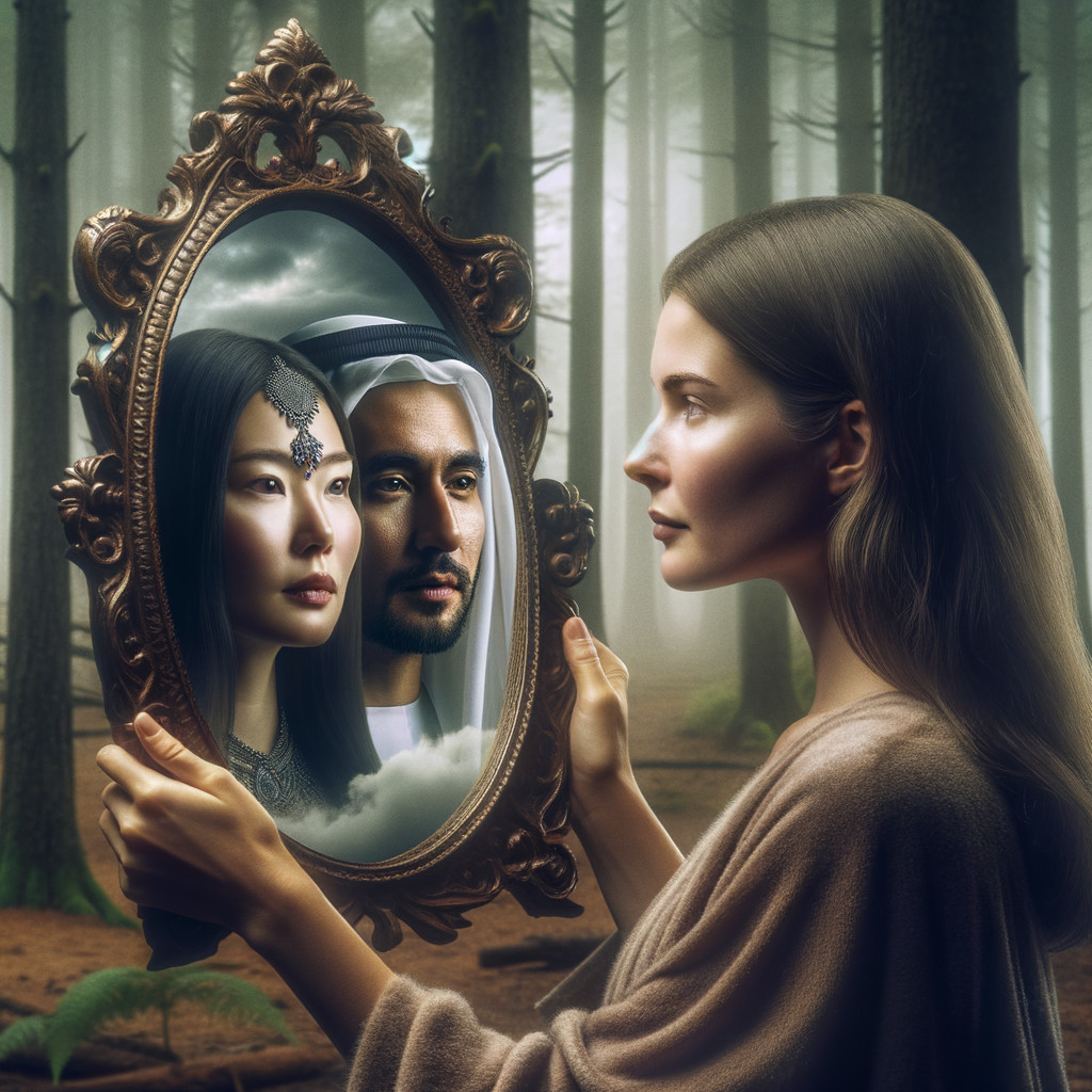 A woman holding a mirror in a forest, revealing the reflection of another woman's face.