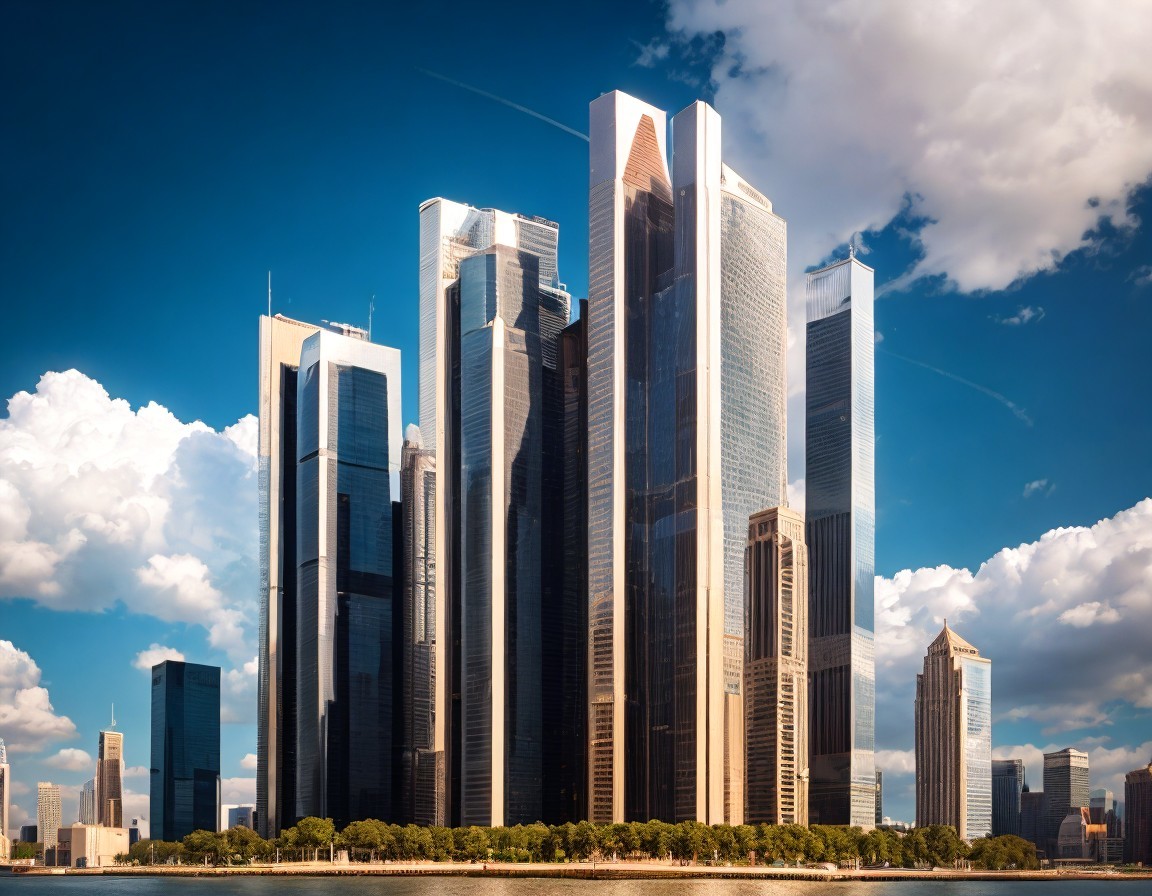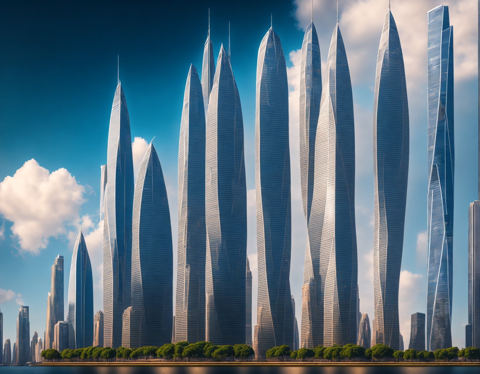 A cityscape with multiple identical skyscrapers in varying opacities under a clear blue sky with white clouds.