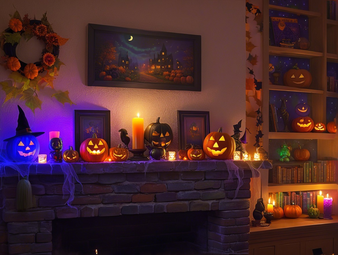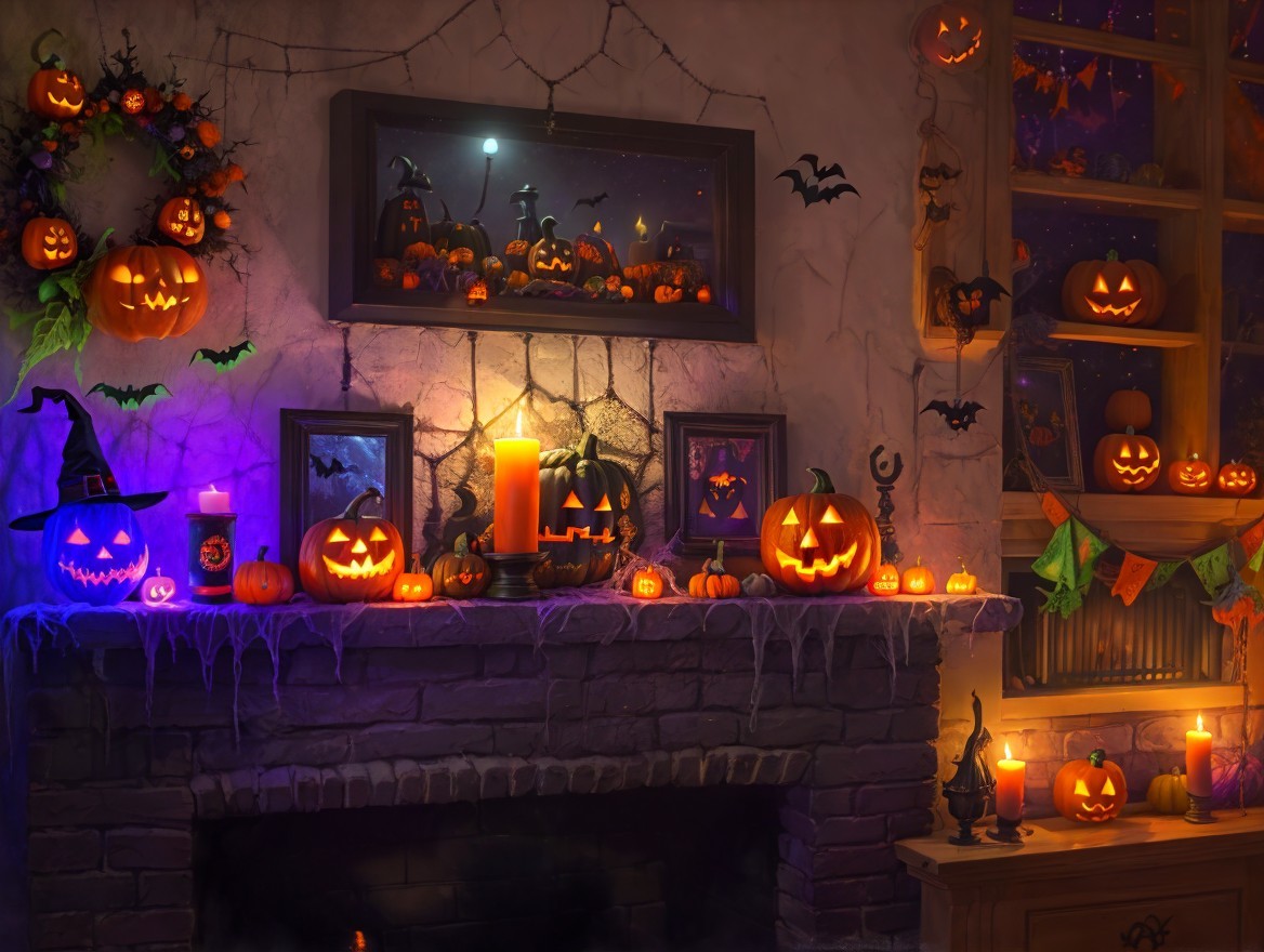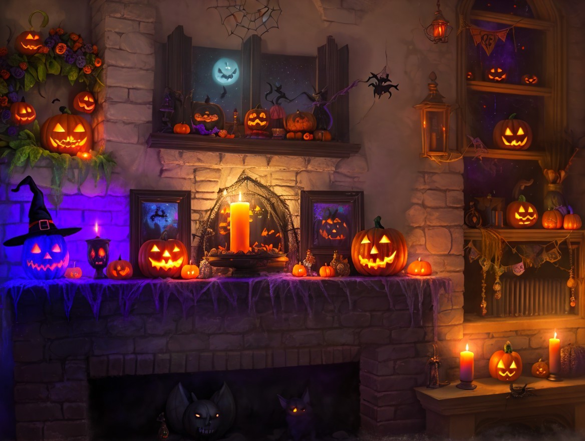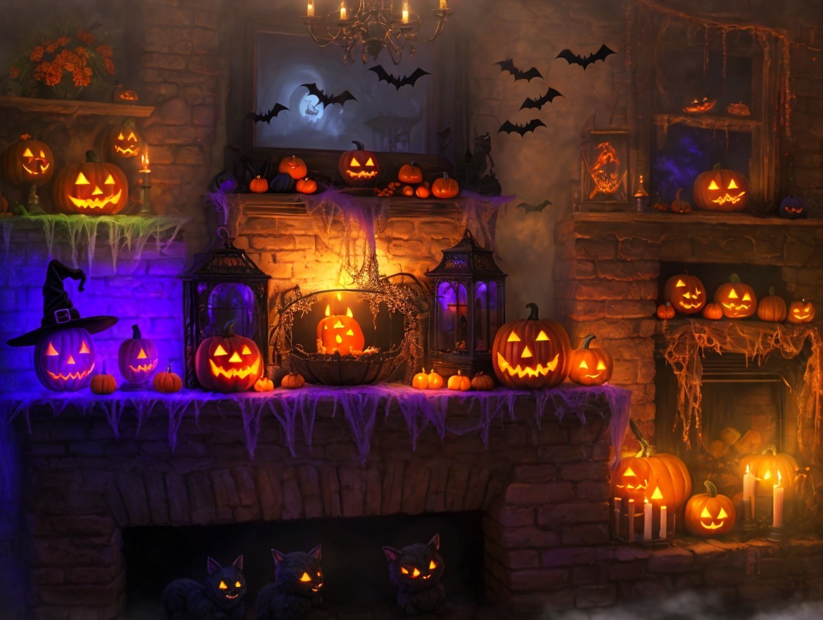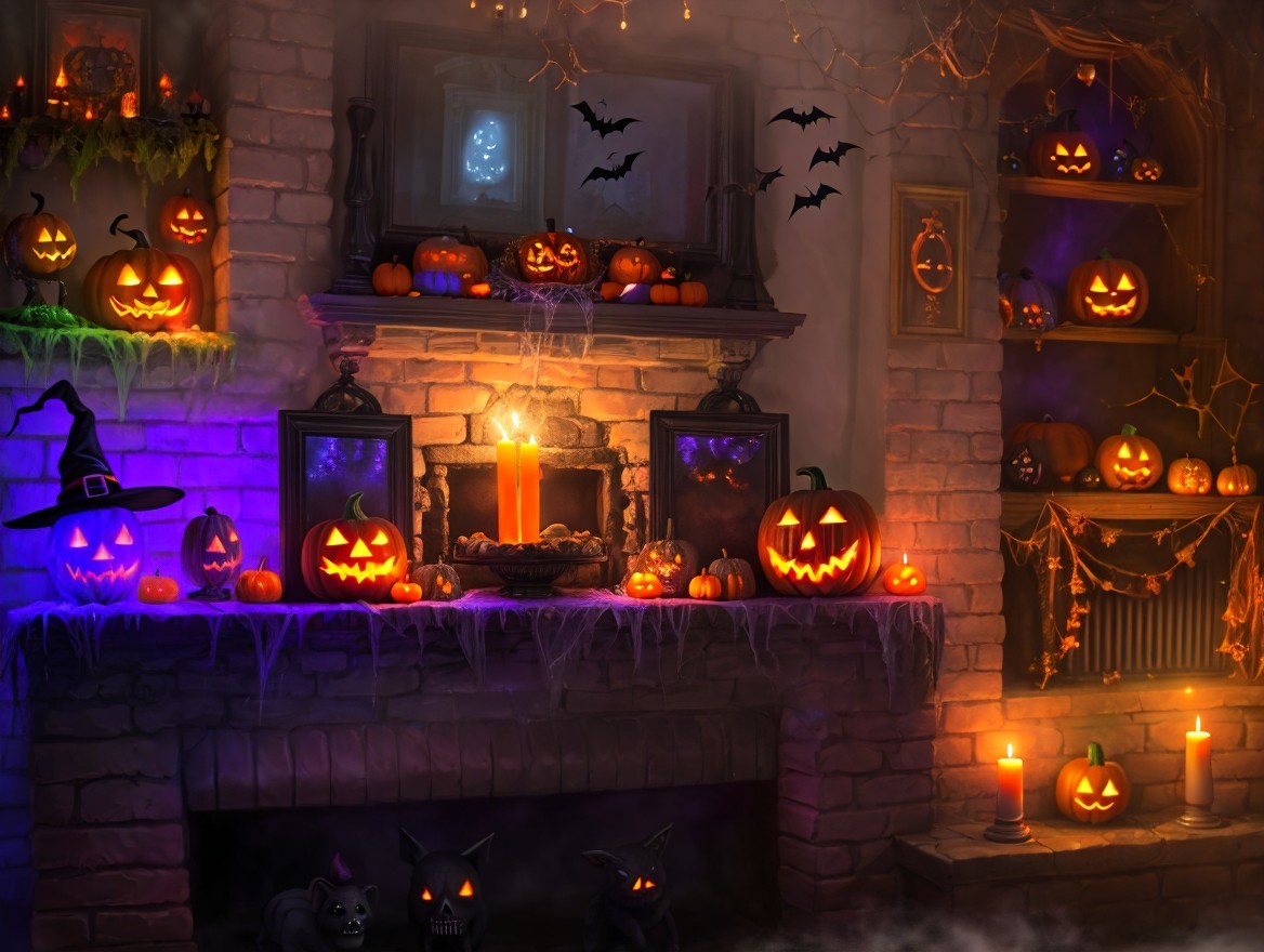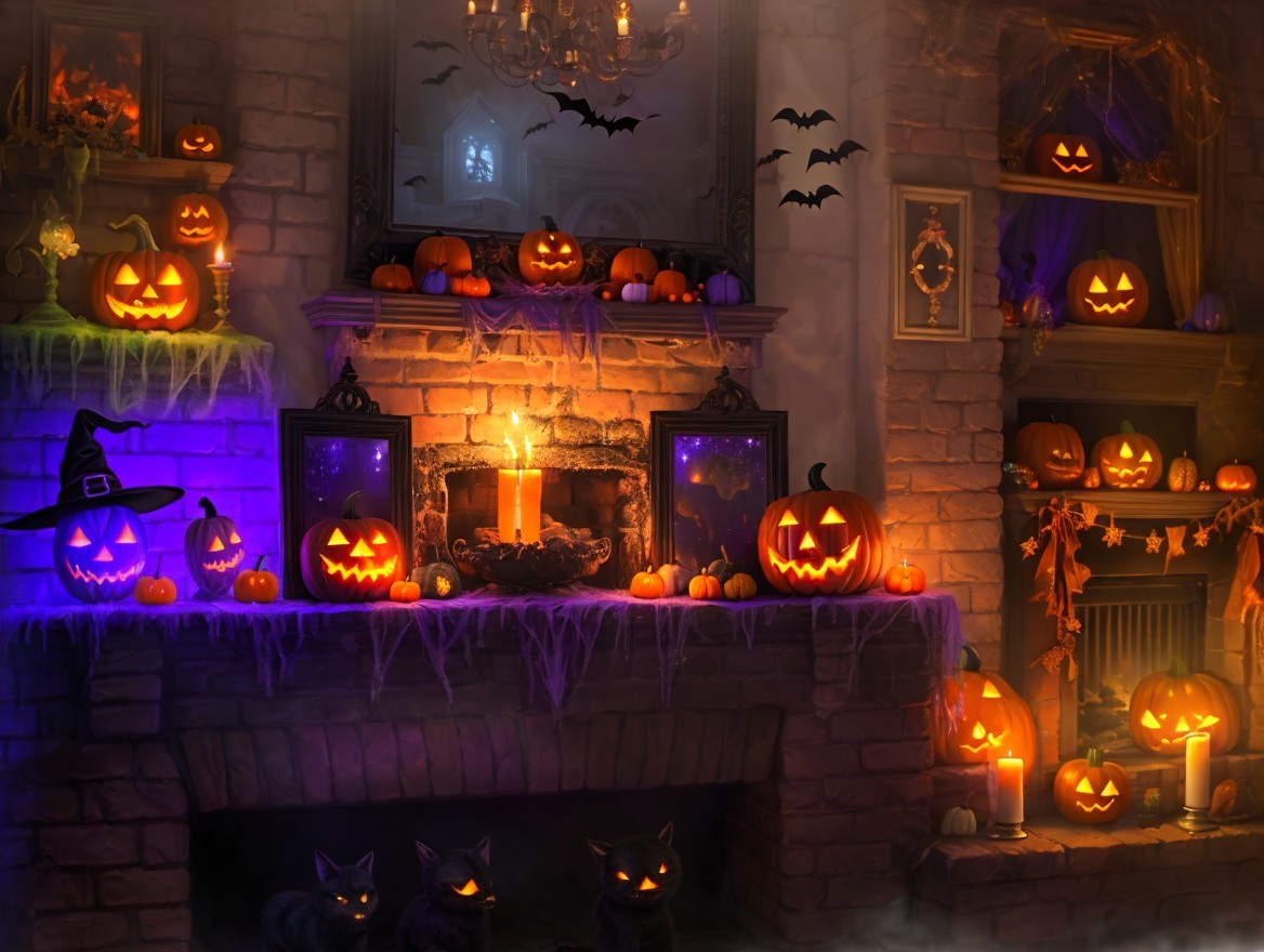 A cozy Halloween scene features glowing jack-o'-lanterns on a stone fireplace, with bats, candles, and cobwebs adding a spooky atmosphere. Dark cats lurk amidst the festive decor.