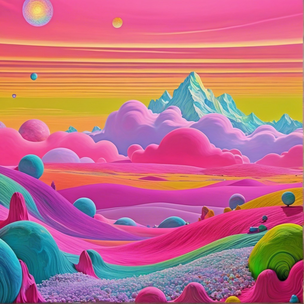 A vibrant, surreal landscape filled with swirling pastel hills and colorful spheres, set against a dreamy sky of soft pinks and blues, creating a playful and otherworldly atmosphere.