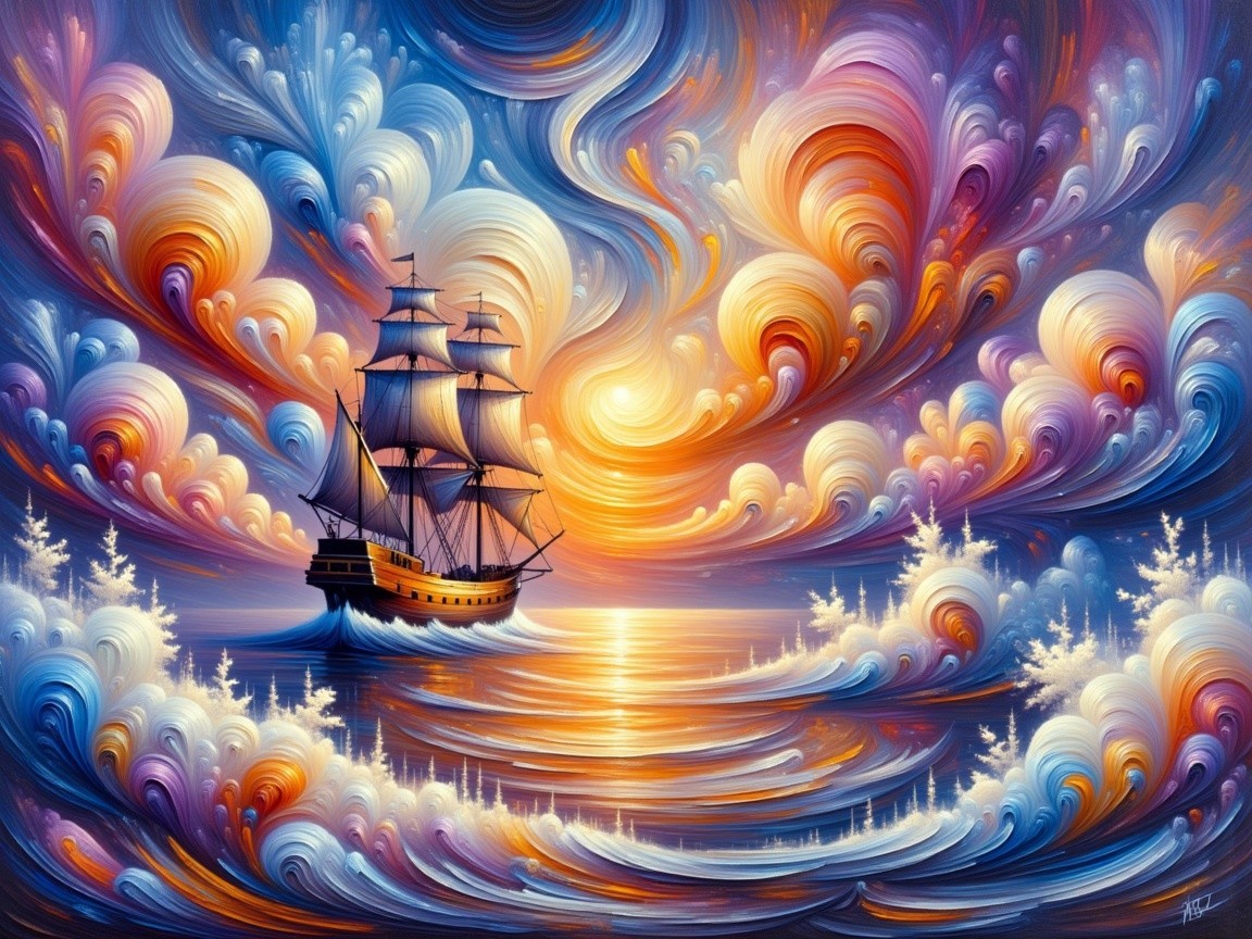 A vibrant, swirling seascape features a majestic ship sailing through colorful waves under a dramatic sky filled with swirling clouds and a radiant sunset, blending warm and cool tones harmoniously.