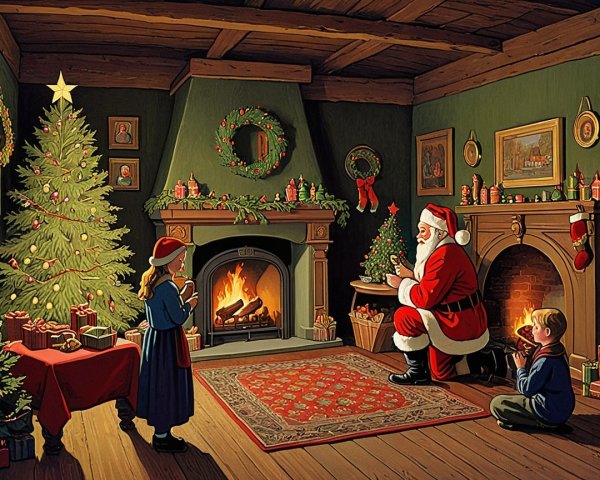 The scene depicts a festive room decorated for Christmas, with a jolly Santa and a family engaged in gift preparation. Holiday cheer fills the atmosphere, enhanced by a cozy fireplace and decorations.