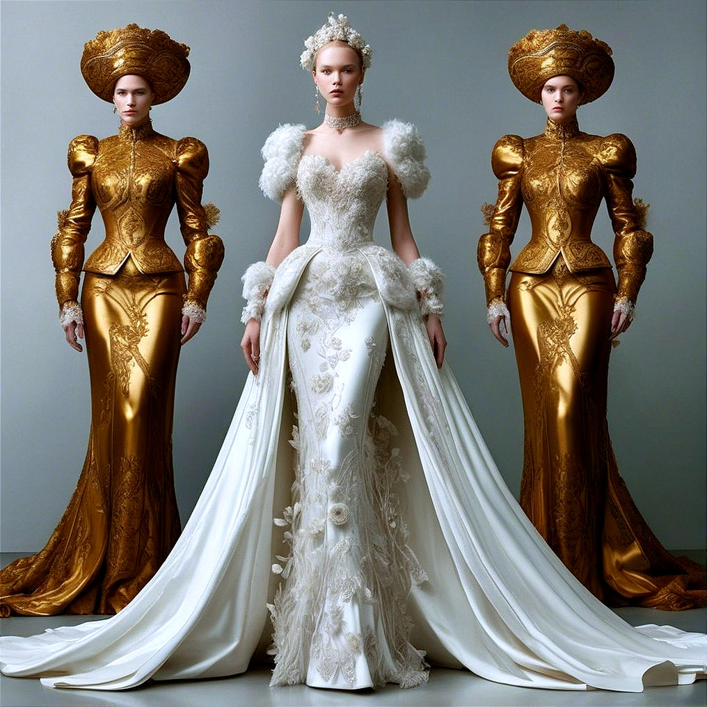The image showcases three elegant modelsdressed in luxurious gowns. The central figure wears a stunning white dress adorned with floral details, flanked by two gold-structured outfits.