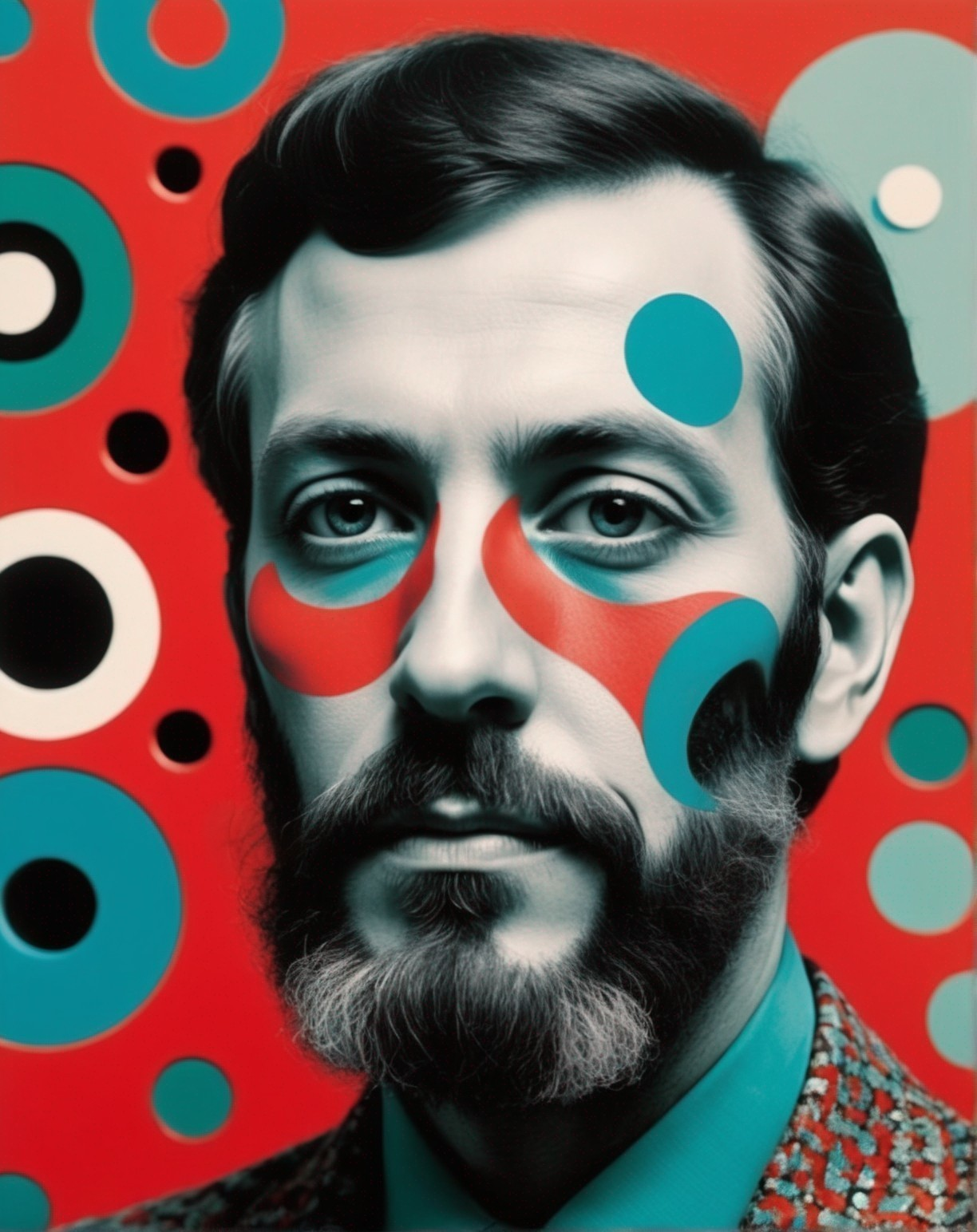 A portrait of a man with a beard and mustache, featuring colorful, retro dot patterns superimposed on the face and background.