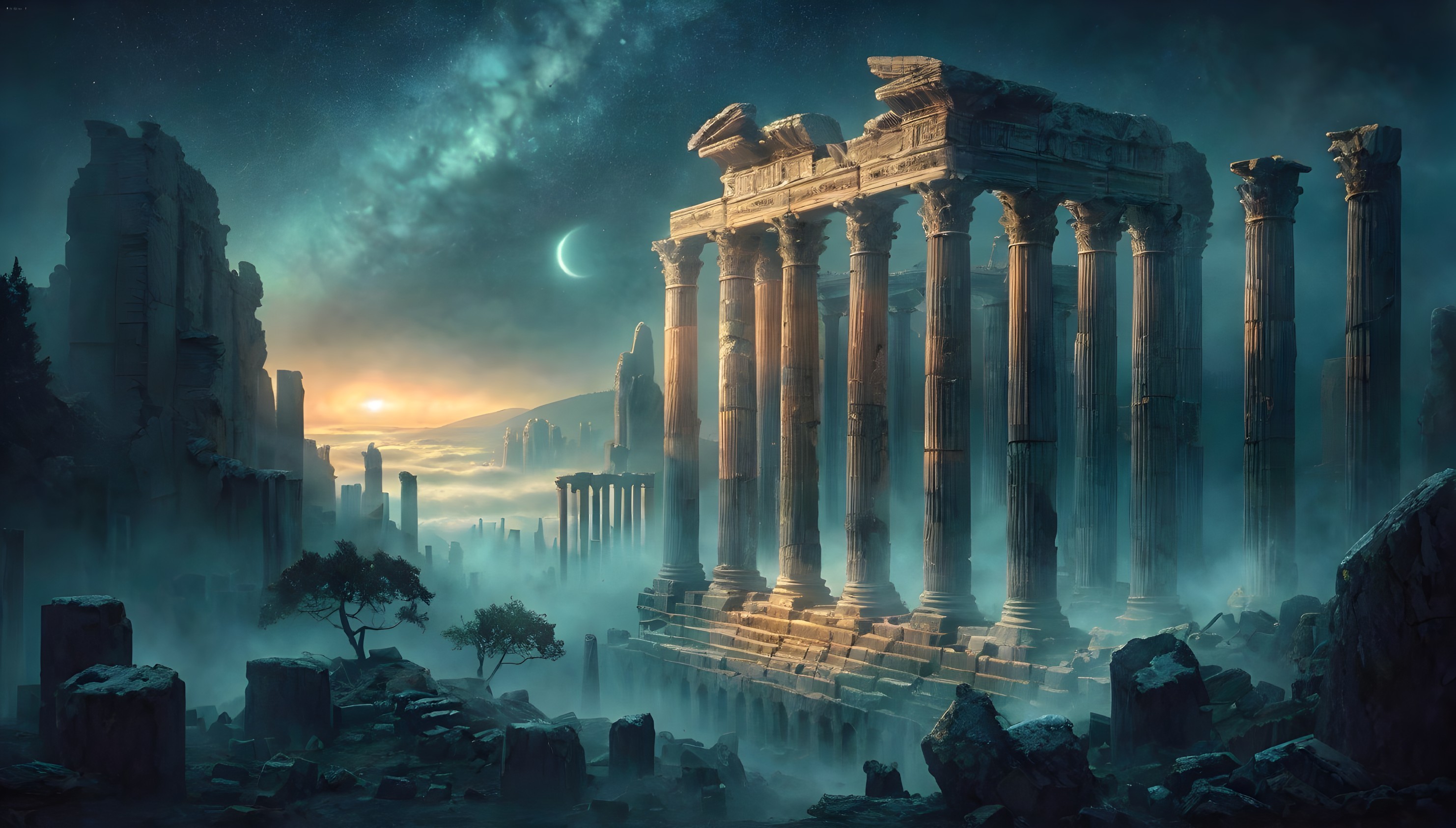 Ancient ruins with columns under a starry sky, with a crescent moon rising above a misty, mountainous landscape at dusk.