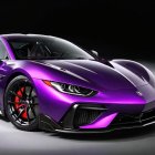 A sleek, futuristic car with a striking purple finish. It features sharp lines, aggressive front styling, and sporty accents, showcasing a blend of luxury and performance in a captivating design.