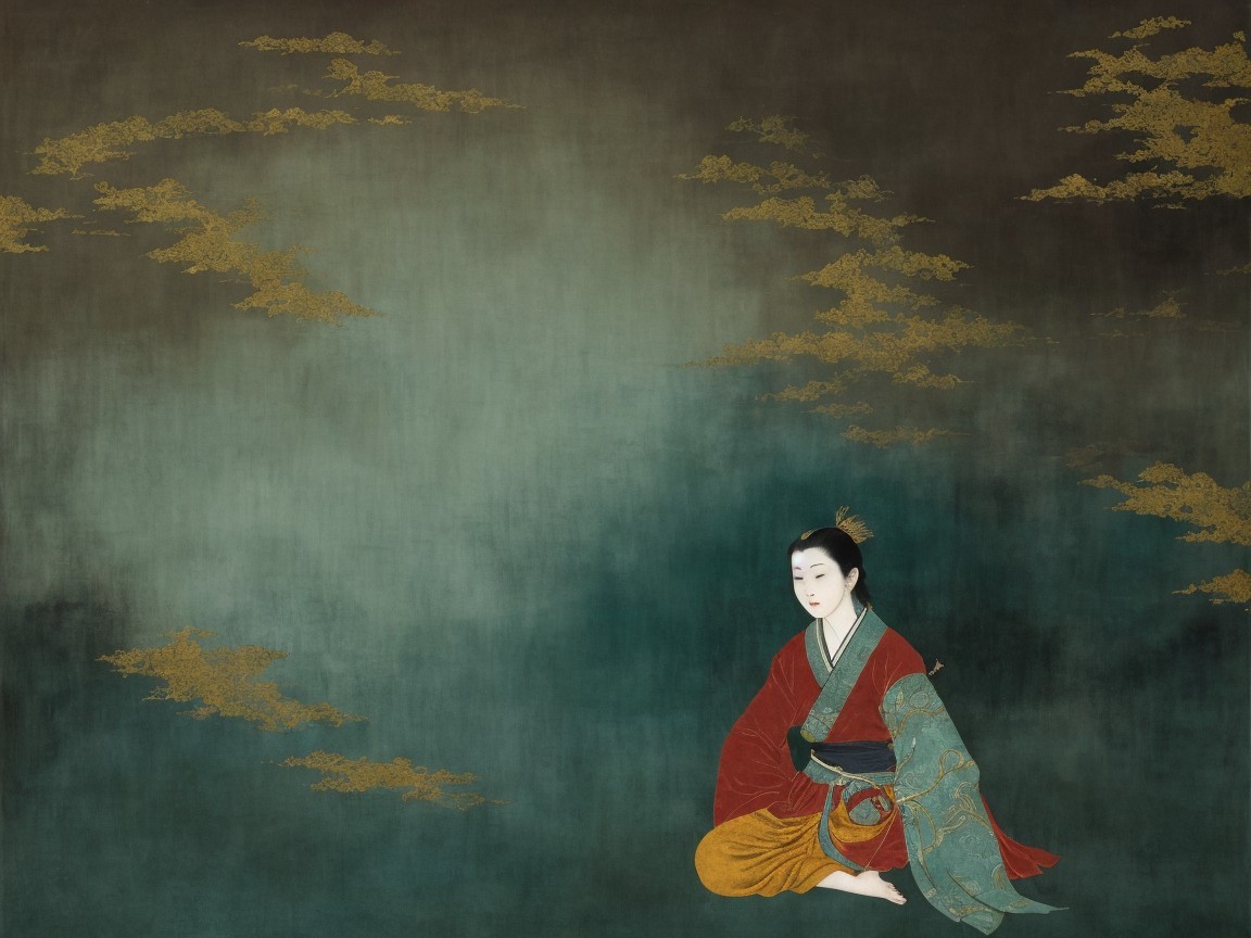 Legend of the boy and the parrot, Medieval Japanese Artists Sumi-e Style, Velvet teal, Shabby, Dull Gold, Amber Gray, marbled. dramatic