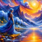A serene Elf in a flowing blue gown sits by a tranquil lake, surrounded by vibrant, swirling clouds and cascading waterfalls, embodying a dreamlike and peaceful atmosphere.