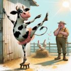 A cheerful cow dances joyfully on one leg, wearing a red bandana, while a smiling farmer looks on. Chickens scatter around, adding to the lighthearted farm scene.