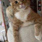 A close-up of a person with their back facing the camera, featuring an orange tabby cat comfortably perched on their shoulder, with soft indoor lighting creating a warm, cozy atmosphere.
