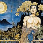 A serene and stylized scene features a shirtless man standing among bamboo, gazing thoughtfully at a tranquil landscape, with a full moon illuminating the night sky and mountains in the background.