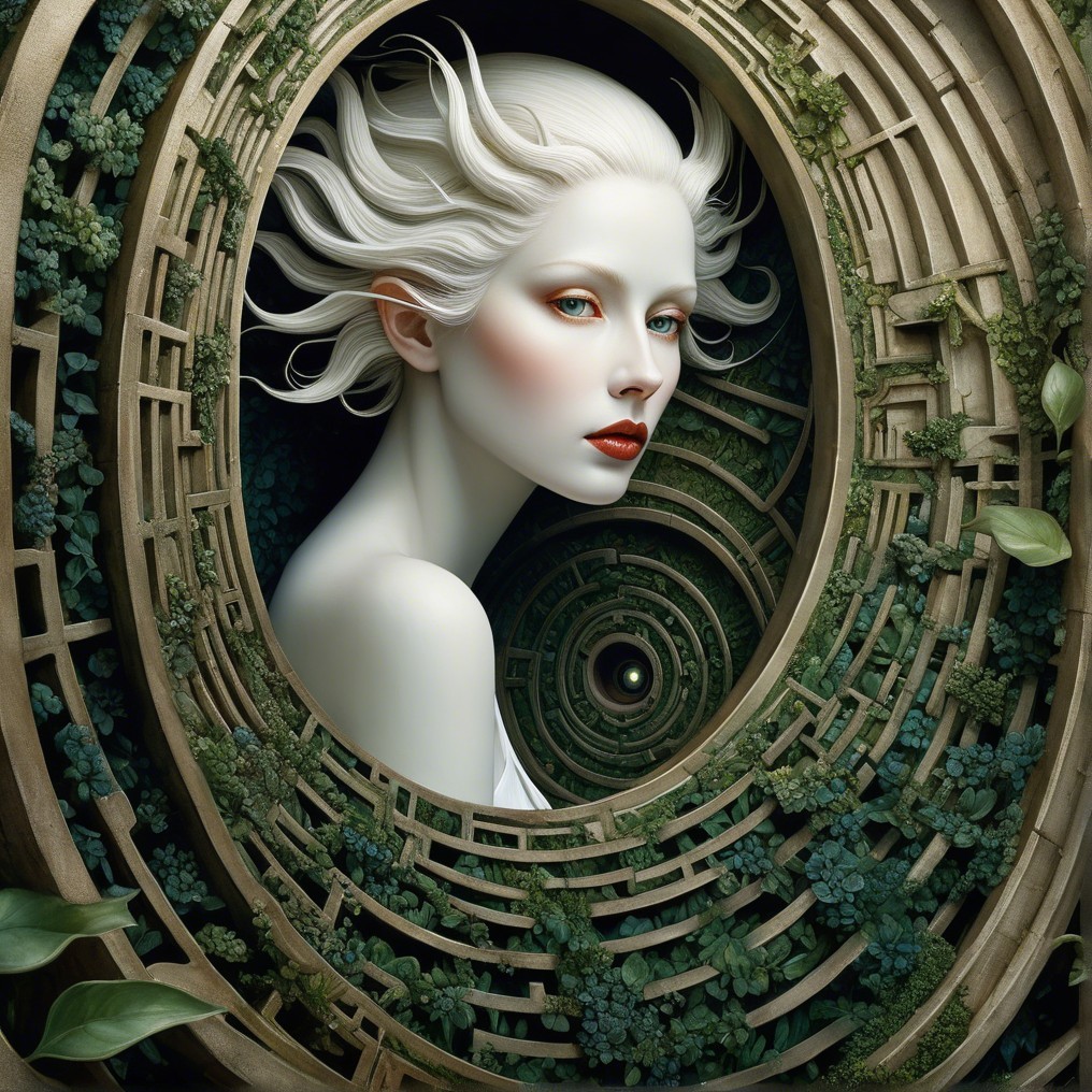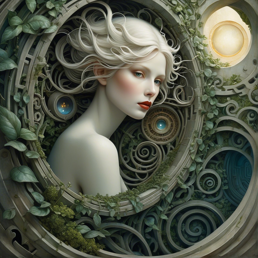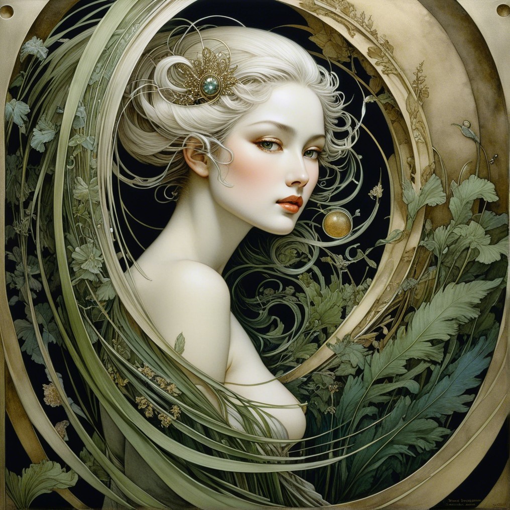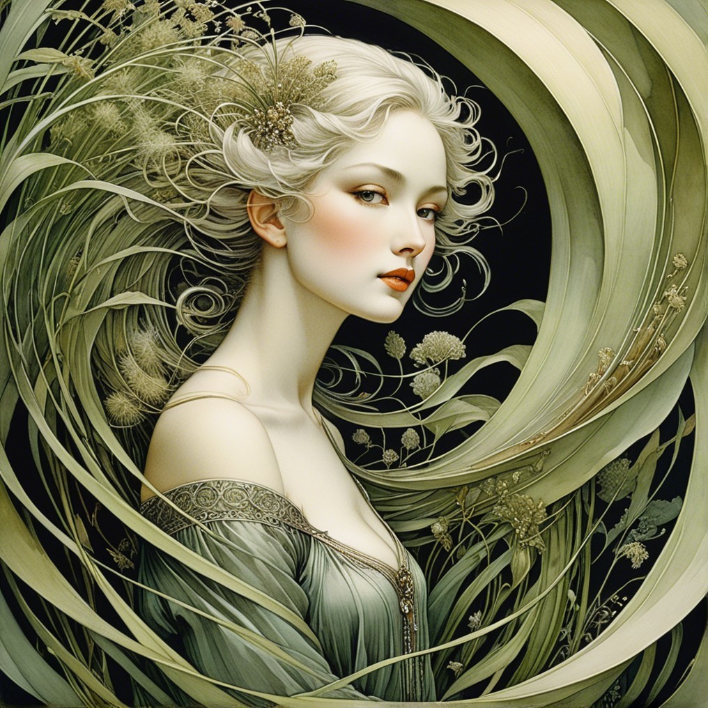 A graceful figure in an elegant dress, surrounded by flowing green grass and delicate floral elements. Her flowing hair and serene expression evoke a sense of harmony with nature.