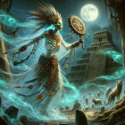A whimsical scene features a girl reading while standing in a serene lake, surrounded by towering mountains and a quaint house. Two curious cats watch as celestial bodies illuminate the sky.
