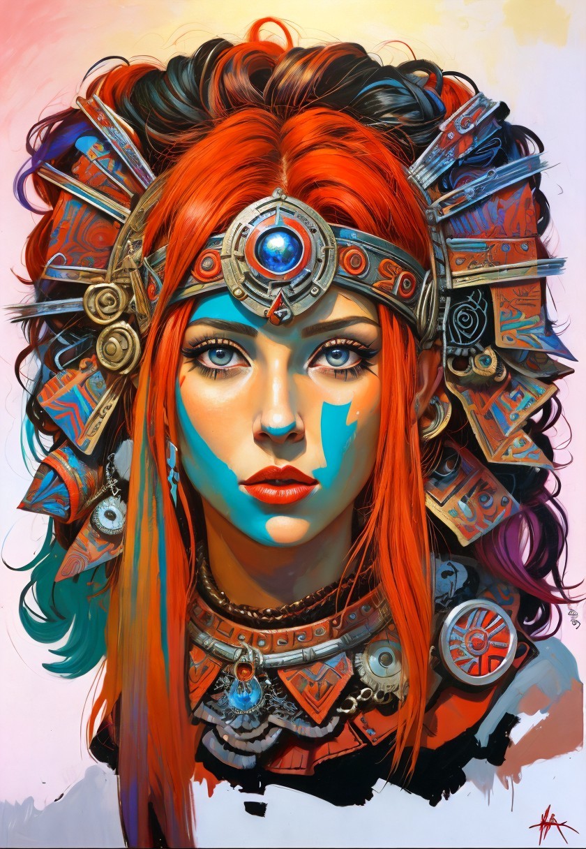 Gouache portraiture, Headshot, female warrior with headpiece, background with portal, sgraffitto merged with line-art, red curly hairstyle, restrained colours, expressive brushwork, stylized artwork, action movement, styled by Banksy, Margaret Keane, Sergio Aragones, Overton Loyd, Moebius, Barbara Canepa, Natalia Zanchevskaya, Horace Pippin, Geof Darrow and Antonio Mora, metallic contraptions, transparent biomorphic details, detailed intricate glossy lips, iron collar, jewelry, hairstyle detailed with wavery brushed watercolor painture, steampunkdetails, hues, metallic jewellery, highly detailed ornamental features, octane render, inkpunk 1.8, ambient occlusion 1.5, anisotropic filtering 1.2, raytraced shadows 1.2, heretic, traumacore 1.2, american gothic 1.7, beautiful composition 1.9, tetradic colour scheme grey beige red mauve perfect handsface, zentangle, biomechanical details, gothic horror essence, perfect handsface, psychedelic iridescence, comic book art, synthetic essence, sketchbook style, fantasy art, tints of comic book art, Vintage ornate, realistic, synthetic, minimalist female fashion model, tiny lines, abstract brushstroke art, stylized background, chipped texture, volumetric dynamic lighting 1.7, shadow mapping 1.3, translucent details, brightness 1.9, Steampunk, blonde & white hair, gothic grotesquerie, dreamscape, high definition, accent lighting, contrasted with soft delicate colors, flamboyant coloring, octane render illustration 1.5, movie poster art merged with storybook illustration style, ambient occlusion 1.5, stacked-up perspective,