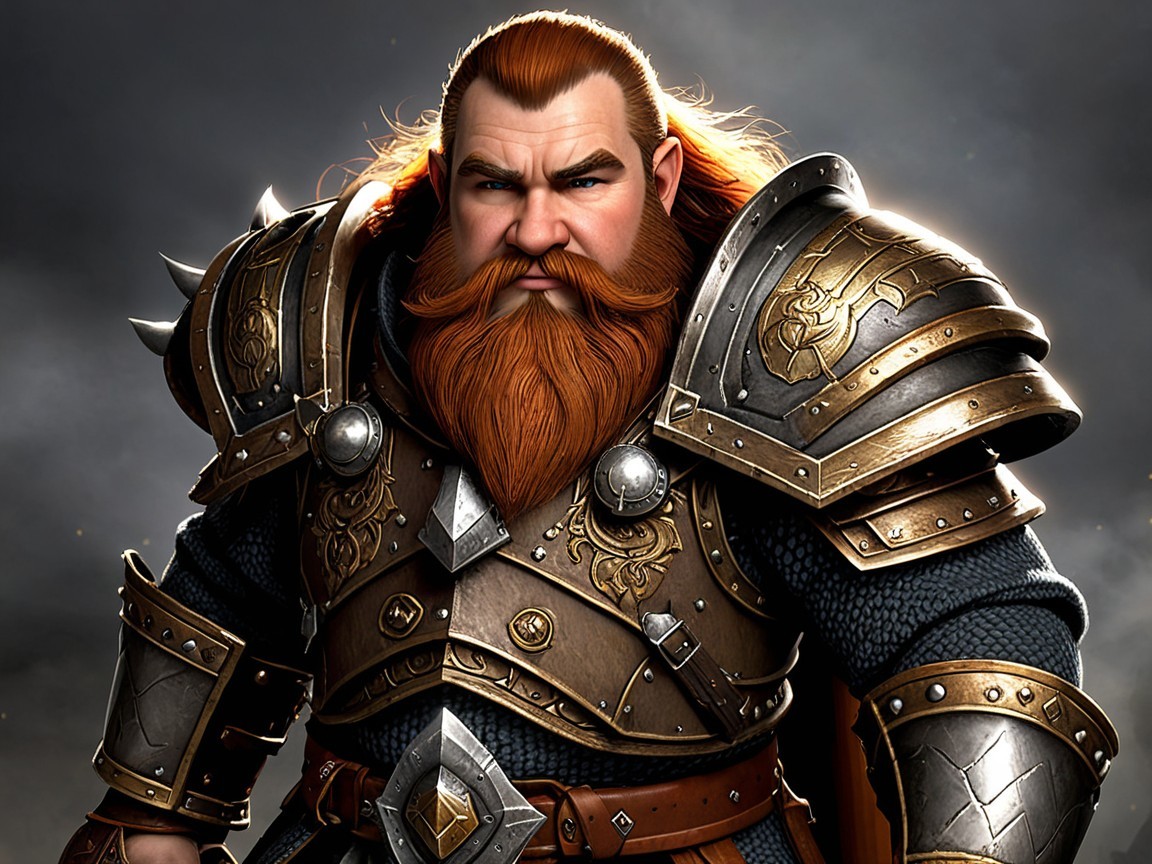 A powerful, armored dwarf stands confidently, showcasing a long, fiery red beard and a determined expression. His intricately detailed armor and accessories highlight his warrior status.