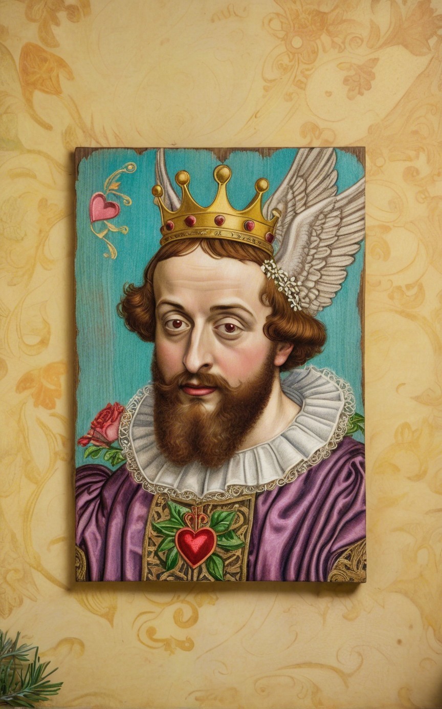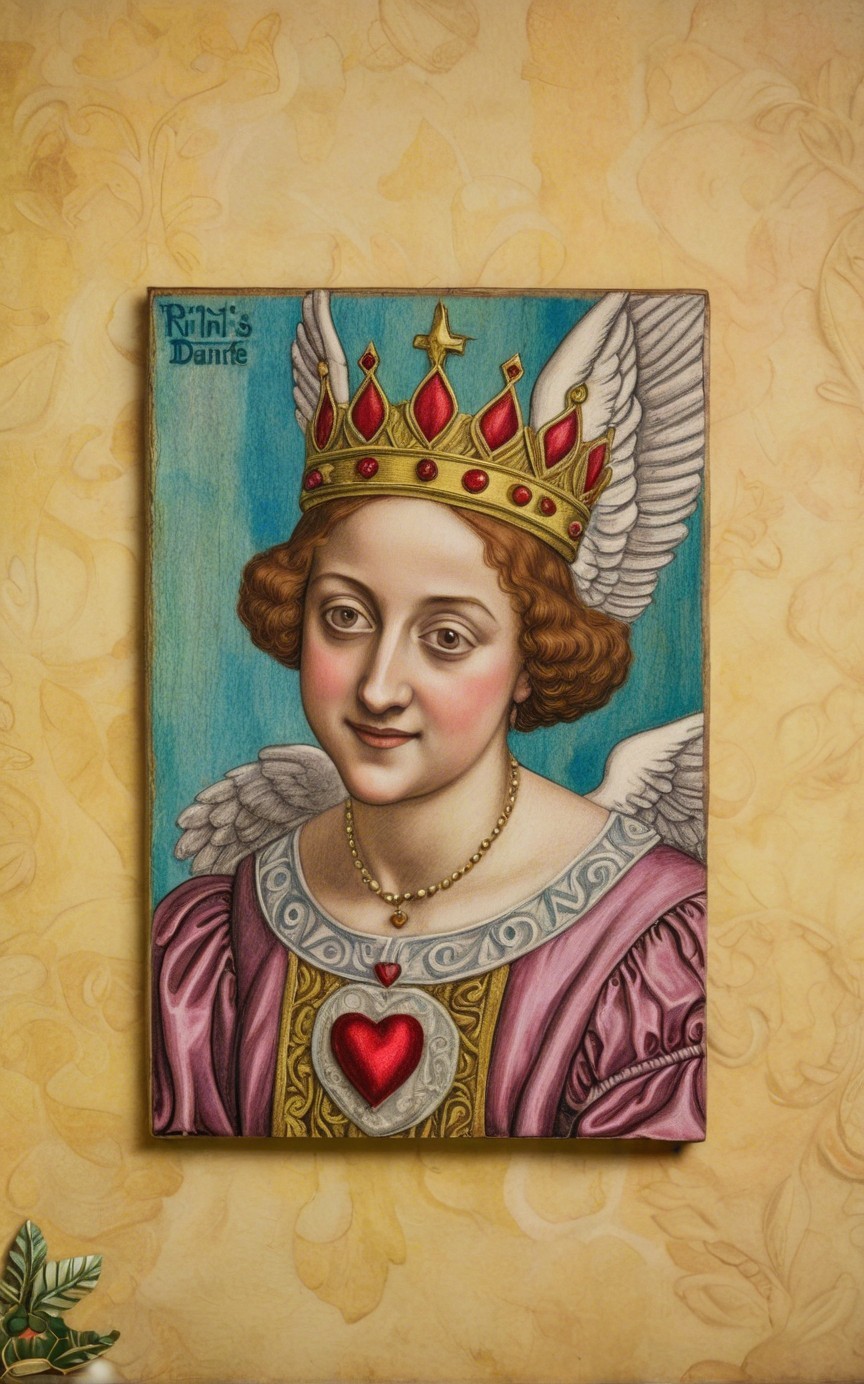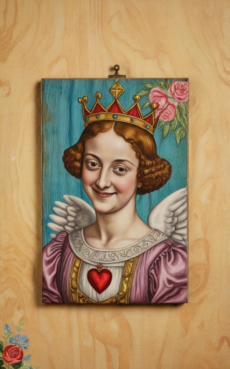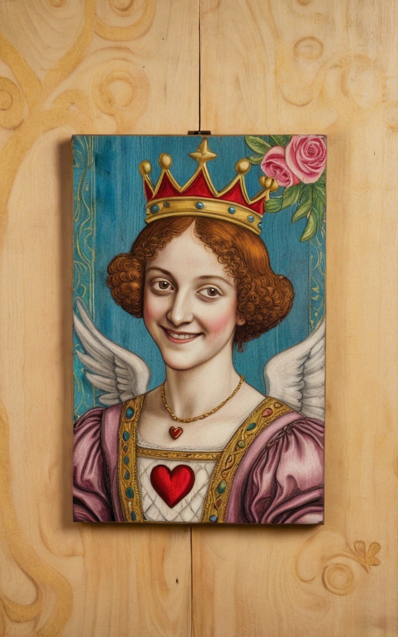 The image features a queenly figure with curly hair and a crown, smiling warmly. She has angelic wings, a heart motif, and intricate details in her attire against a wooden backdrop.