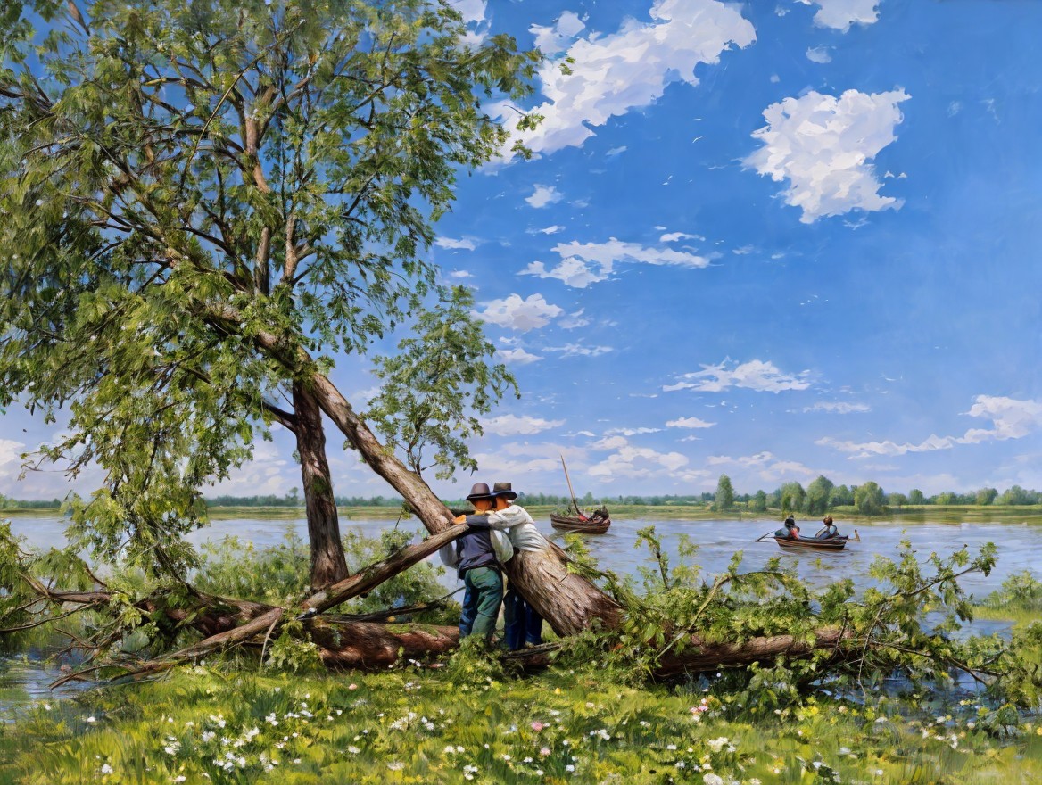 + Prompt:Uprooted trees after storm among modest flowers in bright green grass.