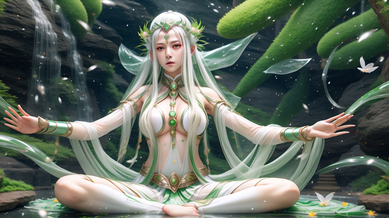 A serene fantasy scene featuring a graceful character with long white hair and floral accents, seated by a tranquil pool surrounded by lush greenery and cascading waterfalls.