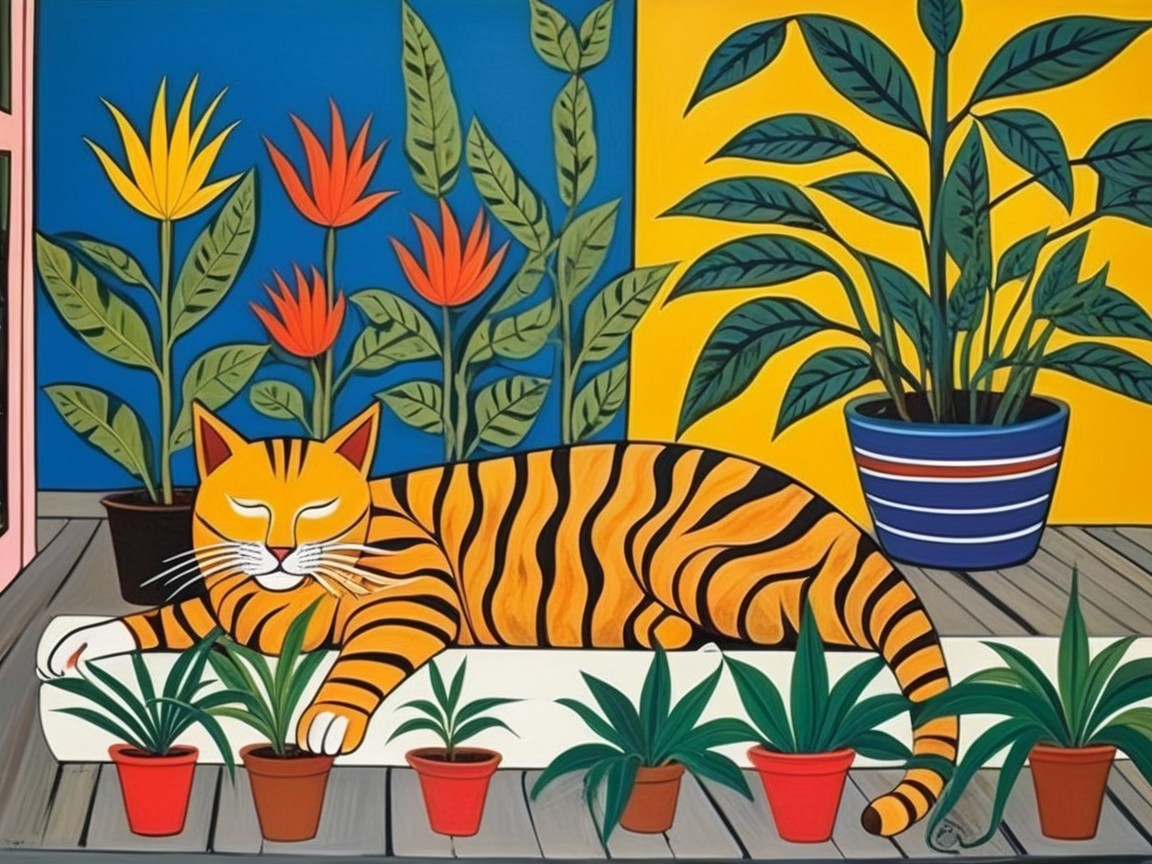 A vibrant, stylized tiger lounges on a blue ledge surrounded by lush green plants. The bold colors and geometric patterns create a playful, eye-catching scene full of personality.