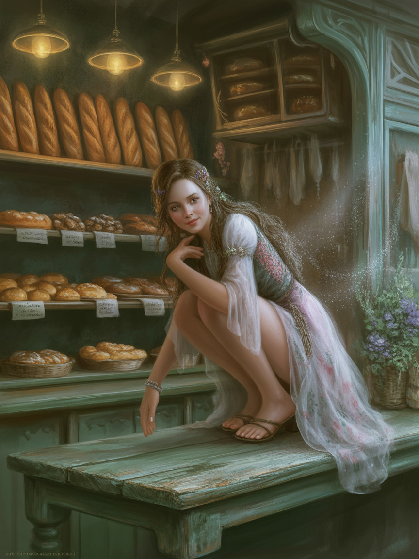 A young woman with flowing hair sits gracefully on a bakery counter, surrounded by freshly baked goods. She wears a delicate dress and exudes a magical, whimsical aura in a cozy setting.