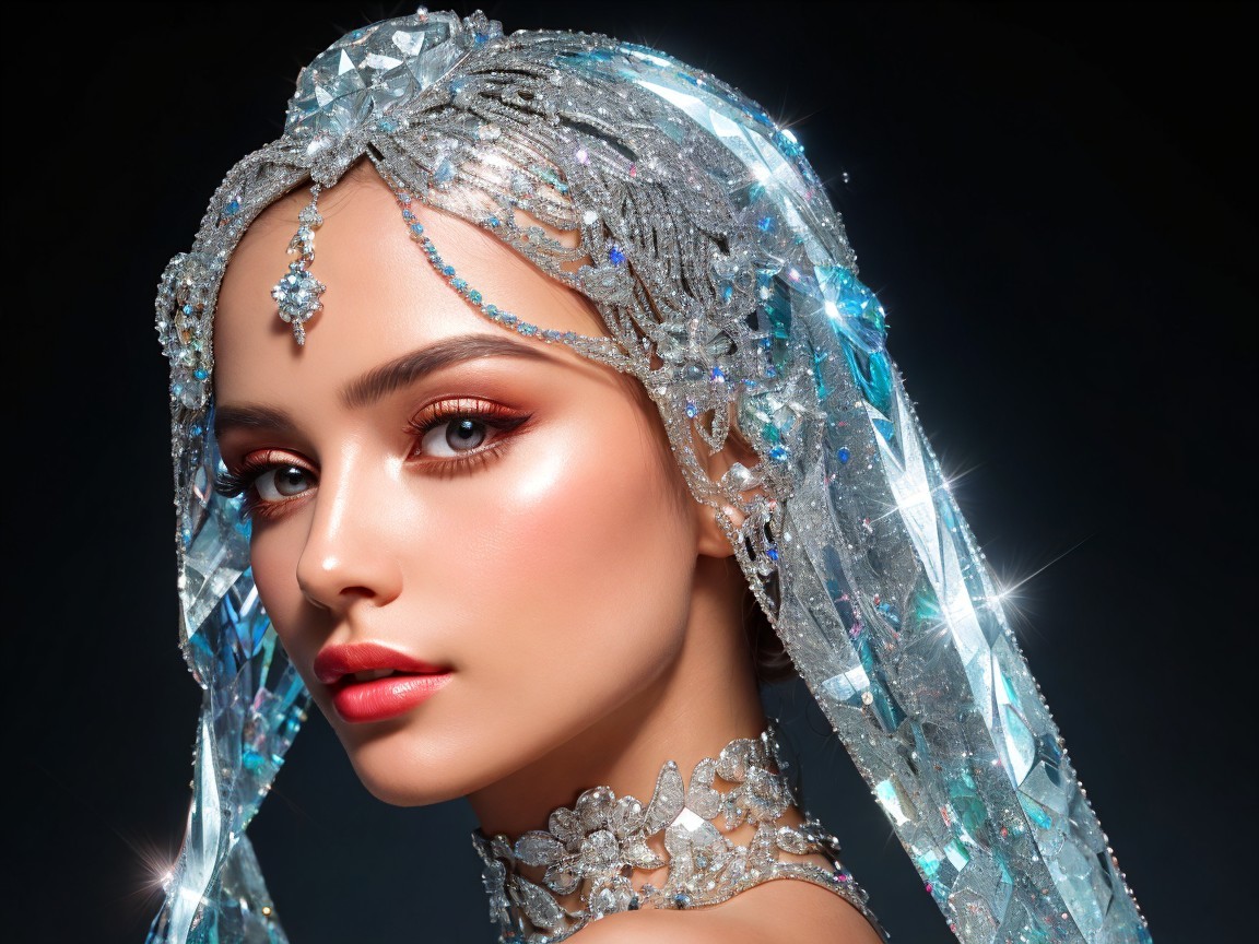 A stunning, glamorous doll with intricate crystal accessories and a shimmering silver veil. Her radiant makeup and detailed jewelry enhance her elegance and allure against a dark backdrop.
