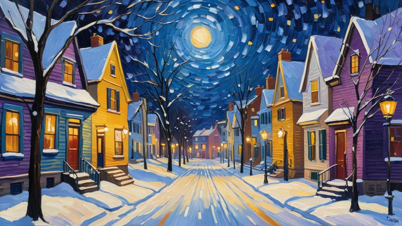 A vibrant oil painting captures a snowy cityscape at night, rendered in a bold, expressionistic style with thick, visible brushstrokes. A full, bright yellow moon, radiating concentric circles of light, dominates the starless deep blue sky which transitions to lighter blues near the horizon. The sky is full of