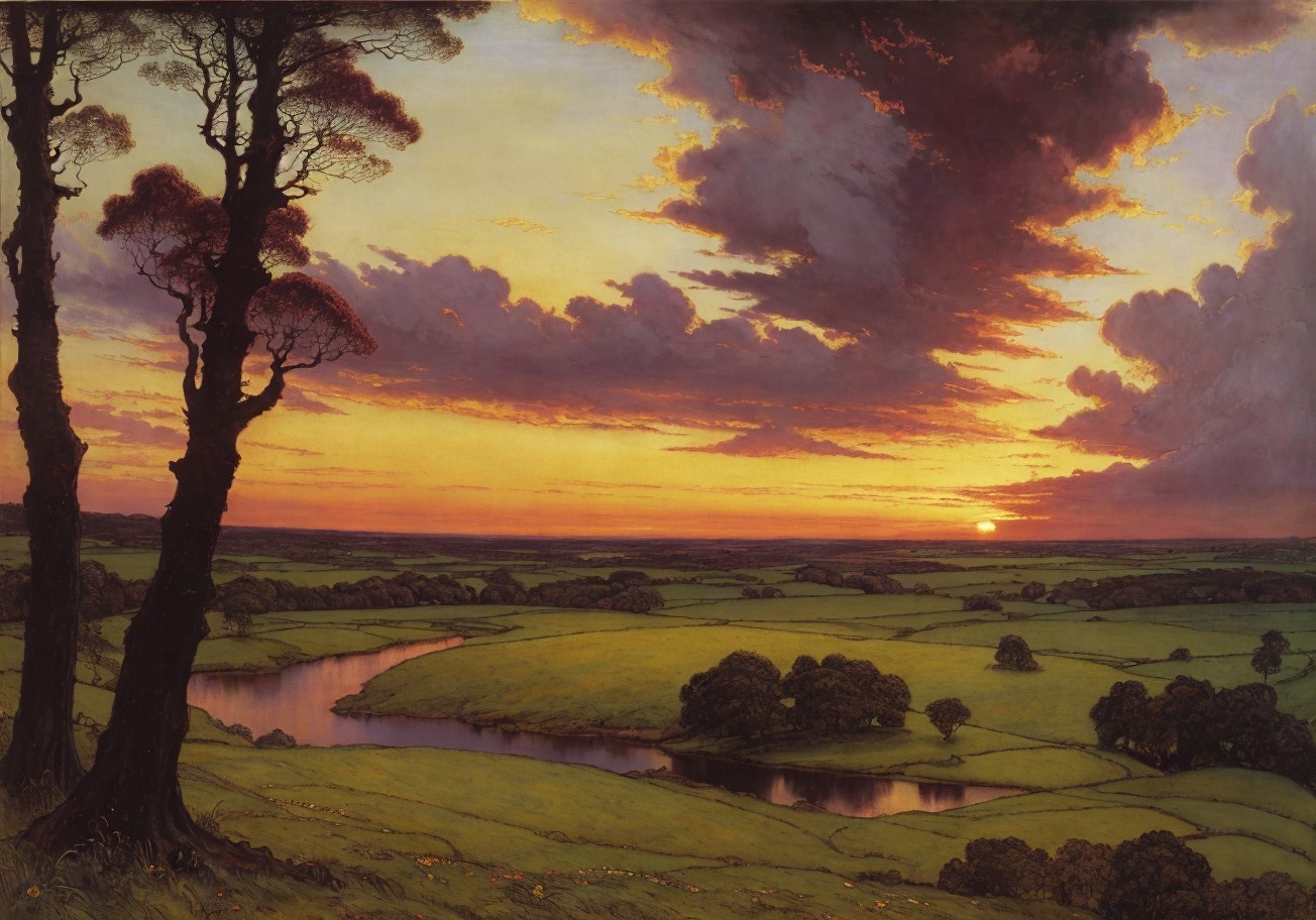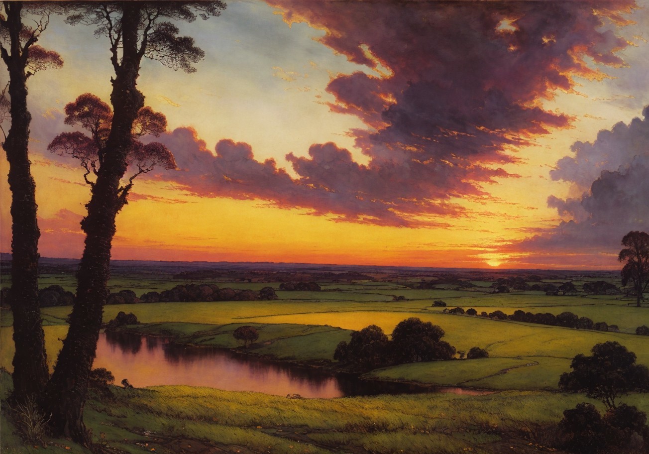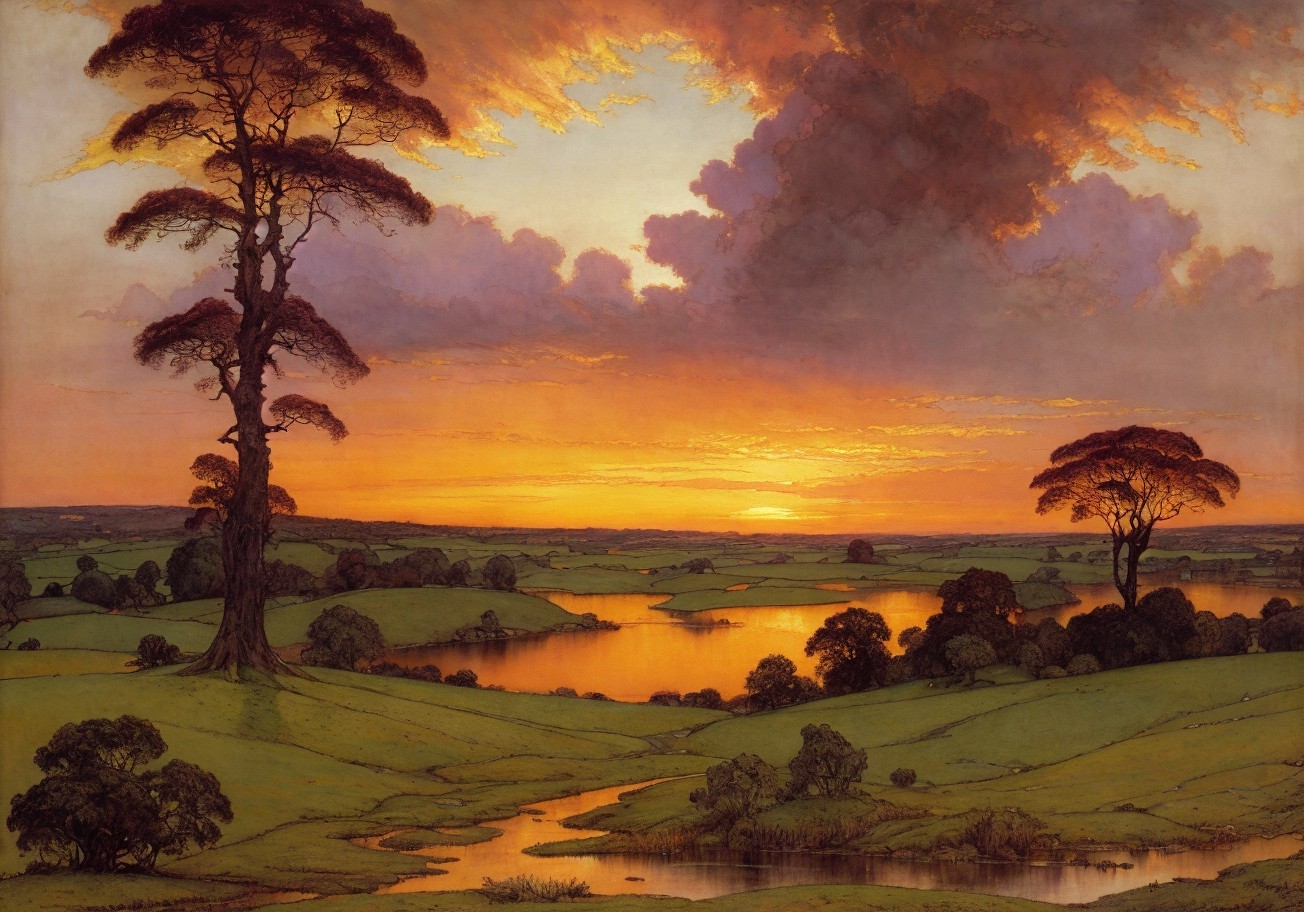Oil on canvas, wide angle landscape view, a wonderful sunset. Glowing with vibrant hues, glowing with vibrant hues, sky transitioning from warm orange to deep purple. Perfect composition. By Arthur Rackham. By William Turner.