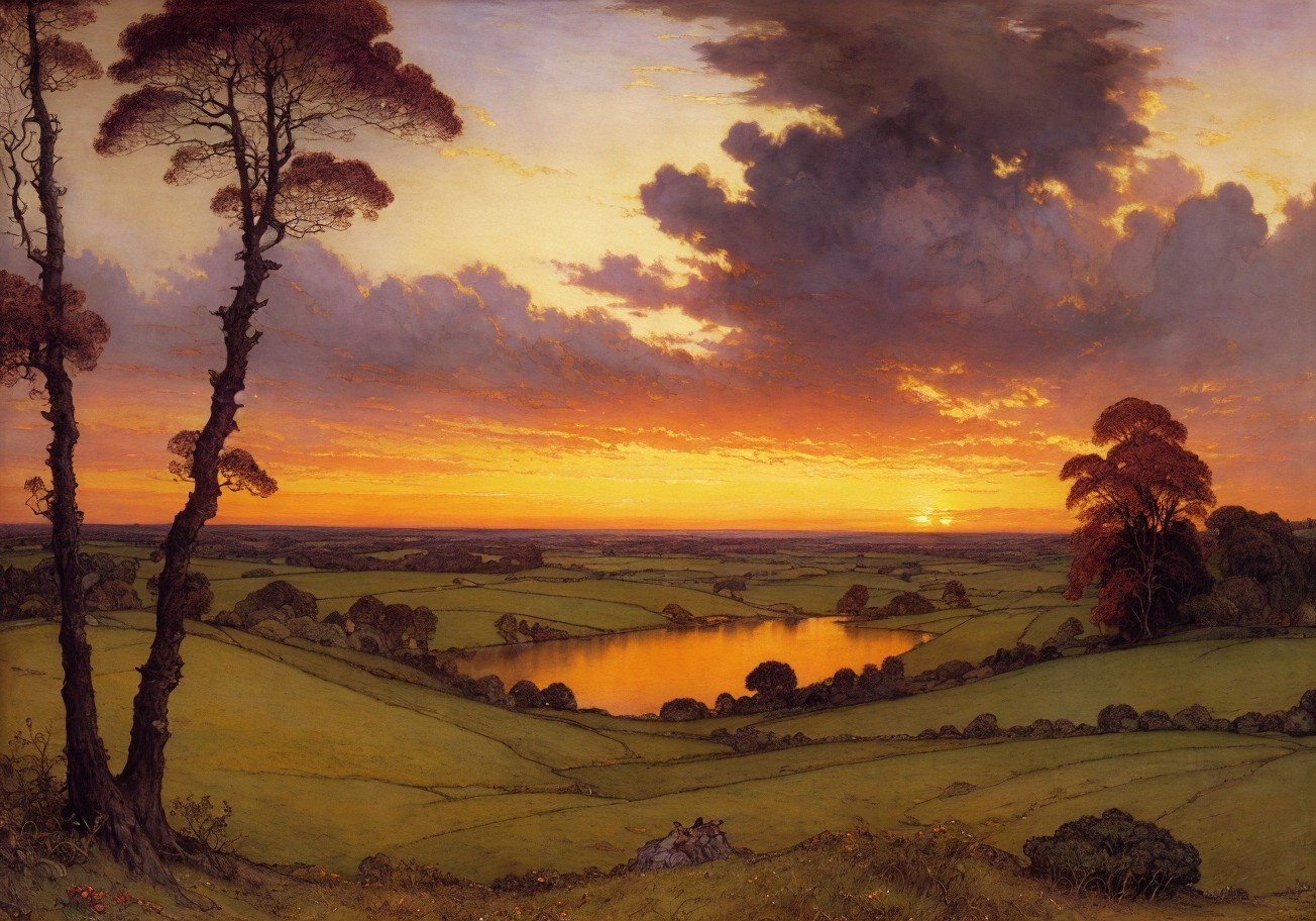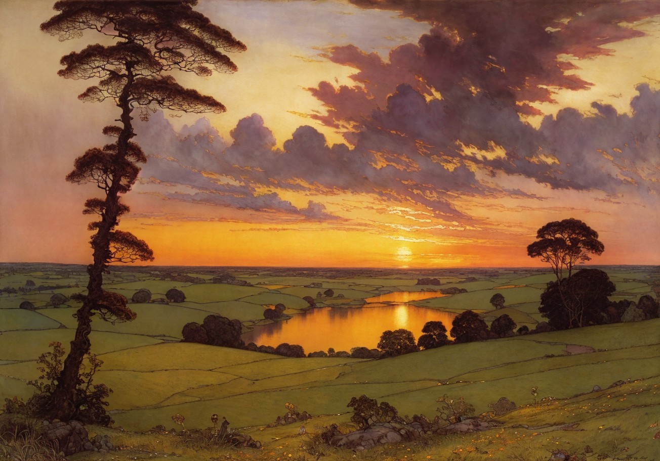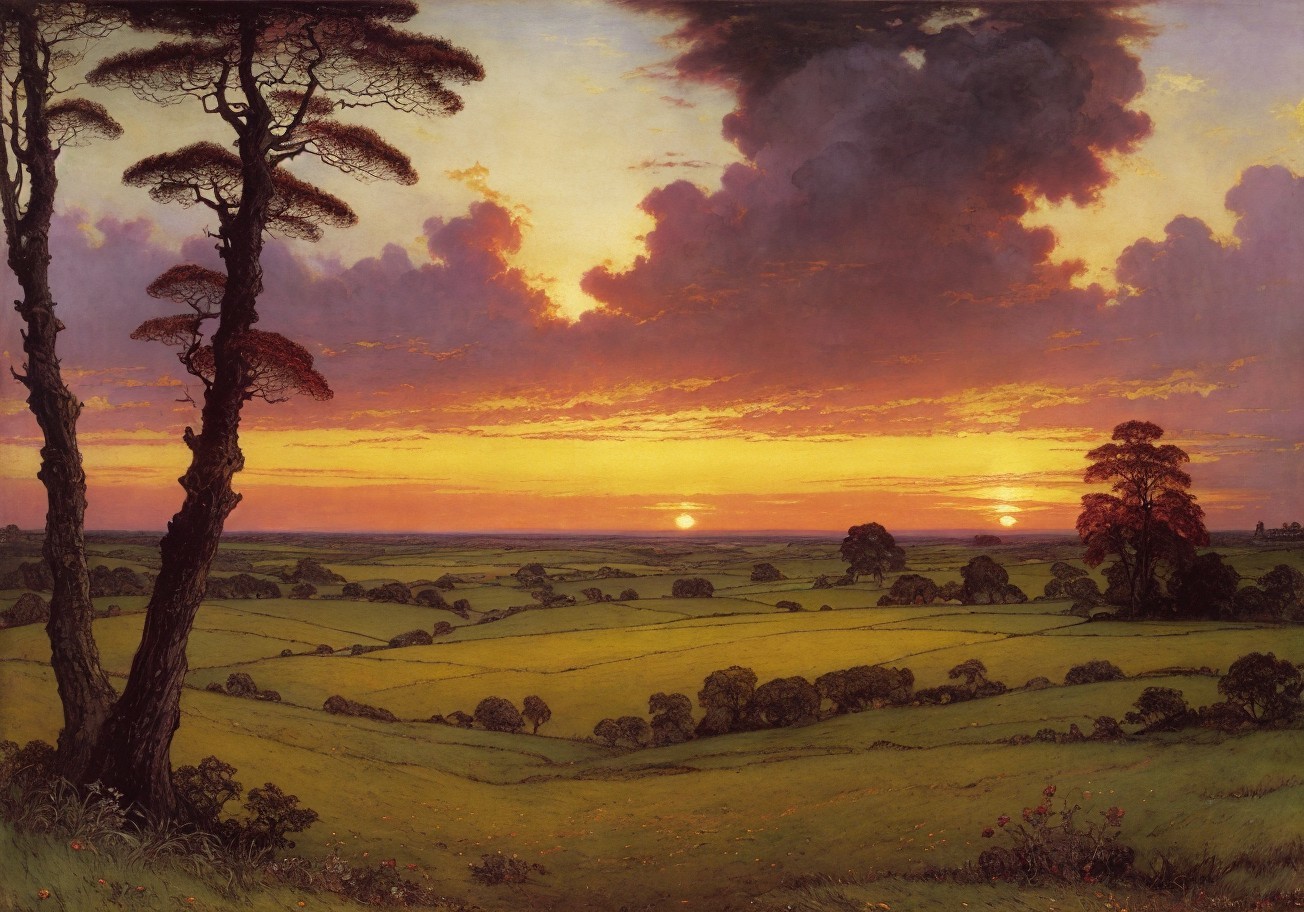 Oil on canvas, wide angle landscape view, a wonderful sunset. Glowing with vibrant hues, glowing with vibrant hues, sky transitioning from warm orange to deep purple. Perfect composition. By Arthur Rackham. By William Turner.